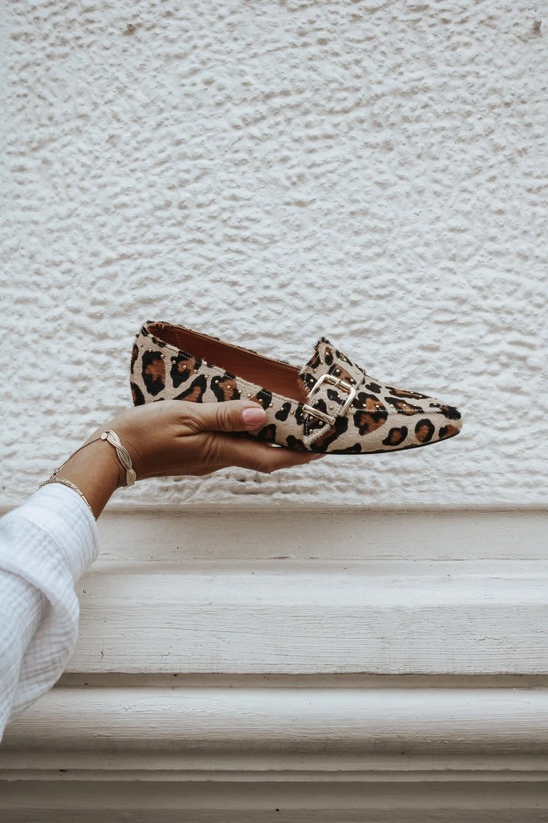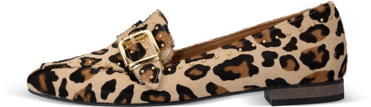 Deze luxe loafers van Babouche wissel je gemakkelijk tussen zakelijk en casual. Je combineert de populaire schoenen bijvoorbeeld met een jeans en een biker jack voor een edgy look of je draagt de schoenen in combinatie met een pantalon en een blouse voor een zakelijke look. Het model is voorzien van goudkleurige studs afgewerkt met een mooie gesp, en zijn gemaakt van leer met een ponyhair Leopard print en studs .De binnen voering is helemaal van leer, en heeft een comfortabele hak (2 cm).