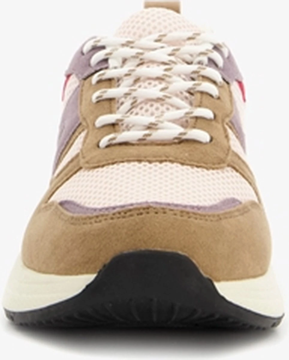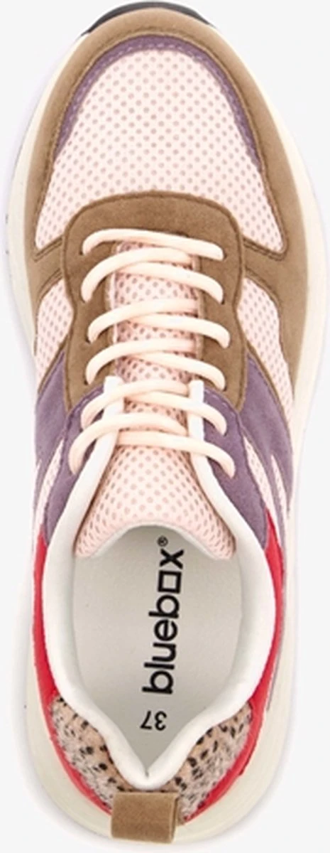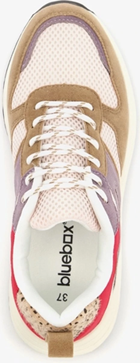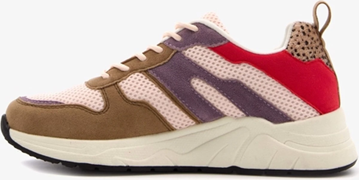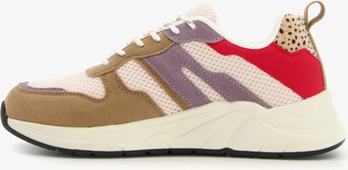 Beige dad sneakers voor dames. Gemaakt van imitatiesuede en textiel, een binnenwerk van textiel en een stevige zool. De dad sneakers hebben een vetersluiting en hiellusje voor een makkelijke instap. Het comfortabele voetbed is gemaakt van imitatieleer. Deze is niet uitneembaar. De dad sneakers hebben rode en paarse accenten op het bovenwerk en cheetah print op de hiel. Deze mini-me sneakers zijn ook verkrijgbaar voor meisjes.