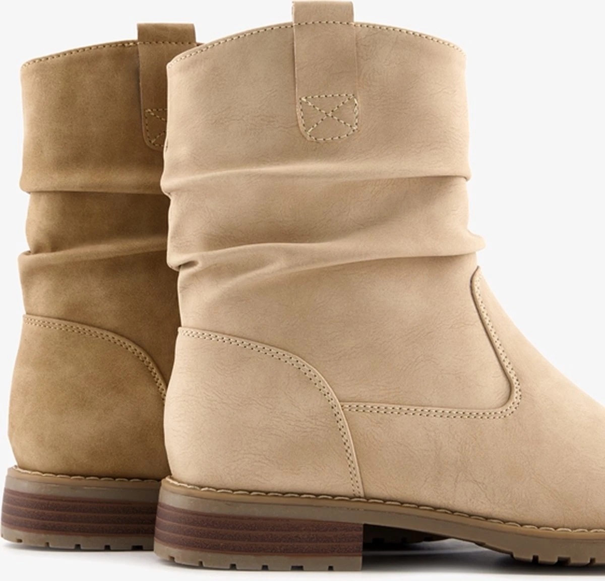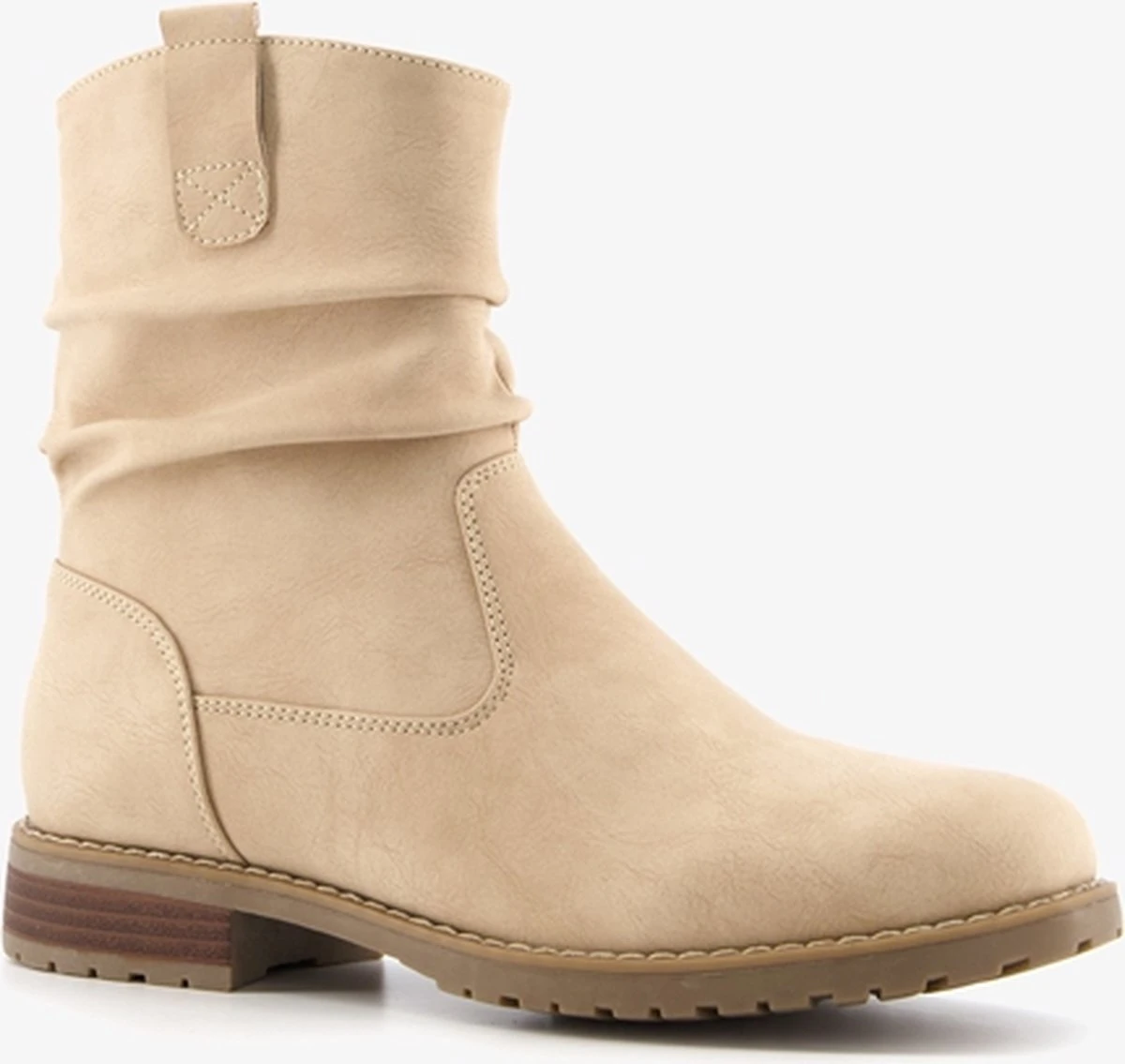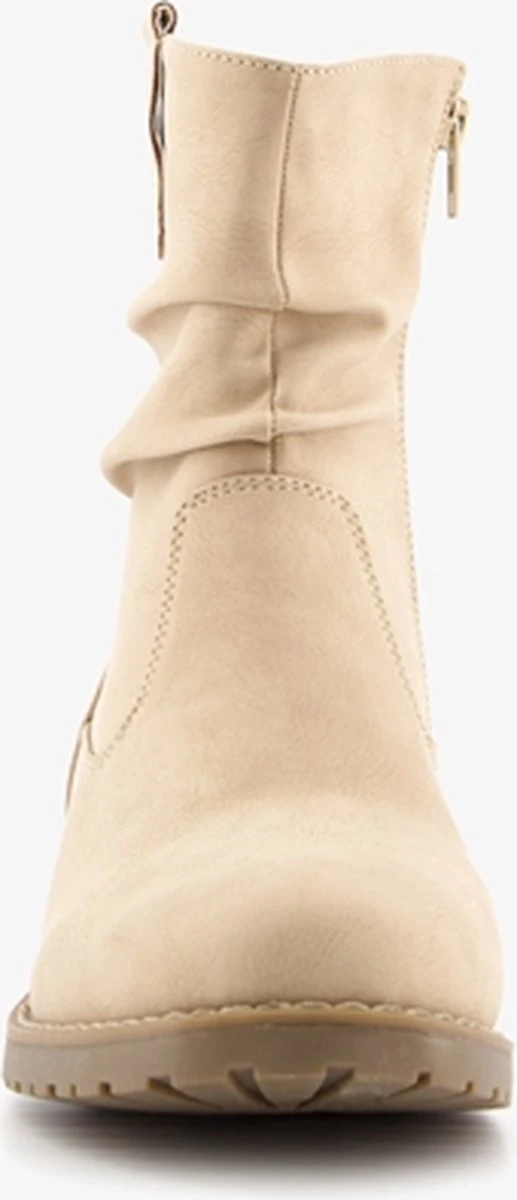 Beige enkellaarsjes voor dames. Gemaakt van imitatieleer, een binnenwerk van textiel en een stevige profielzool. De laarsjes hebben een ritssluiting aan de binnenzijde en vast voetbed van imitatieleer. Voorzien van aantreklusjes bij de instap. De enkellaarsjes hebben een schachthoogte van 17 cm en een lage hak van circa 2 cm.