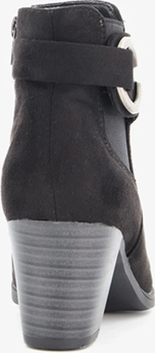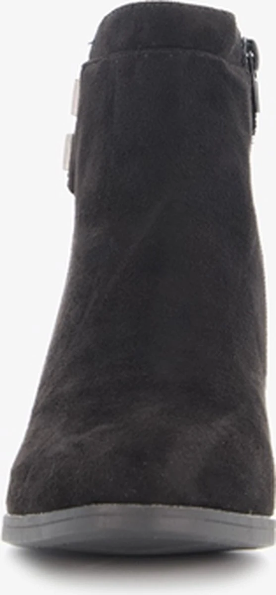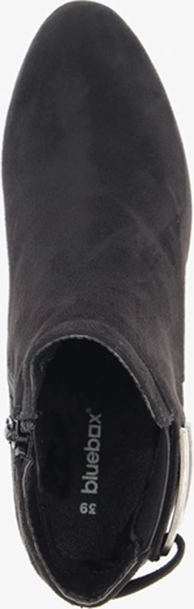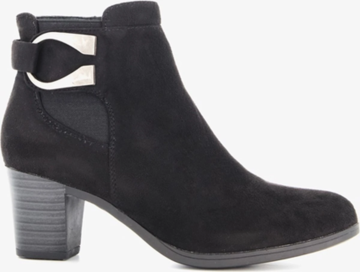 Zwarte dames enkellaarsjes uit de Blue Box collectie. De laarzen zijn gemaakt van imitatieleer, hebben een binnenwerk van imitatieleer en een stevige zool. De binnenzool is gemaakt van imitatieleer, deze is niet uitneembaar. Voorzien van een elastische inzet aan de buitenzijde en een decoratieve gesp. De laarsjes zijn voorzien van een rits aan de binnenzijde en een stevige hak. De hak is circa 7 cm hoog. De schachthoogte is circa 11 cm.