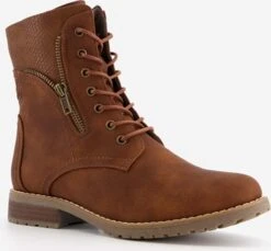 Cognac bruine enkellaarsjes voor dames. Gemaakt van imitatieleer, een binnenwerk van textiel en een stevige profielzool. De gevoerde laarsjes hebben vetersluiting en een ritssluiting aan de binnenzijde. Voorzien van een decoratief ritsje aan de buitenzijde. De vaste binnenzool is gemaakt van textiel. De enkellaarsjes hebben een warme voering en een lage hak van circa 2 cm. De schachthoogte bedraagt 15 cm.