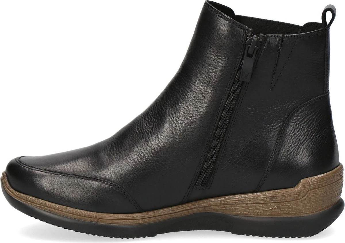 Caprice’s platte enkellaars heeft een leren bovenwerk. De 40 mm hoge sleehak in combinatie met de ronde neus past bij elke outfit.