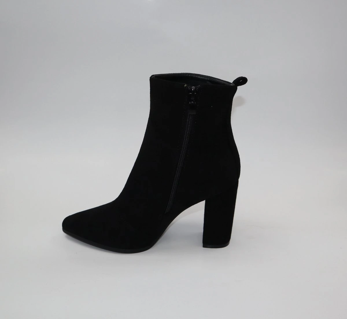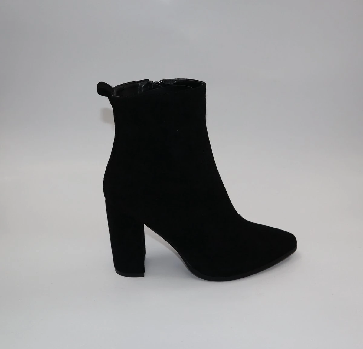 Het product is een modieuze enkellaars met een hak. Het is gemaakt van kunstsuede. Aan de binnenkant bevindt een ritssluiting. Deze pasvorm valt normaal. Verkrijgbaar in maten 36,37,38,39,40