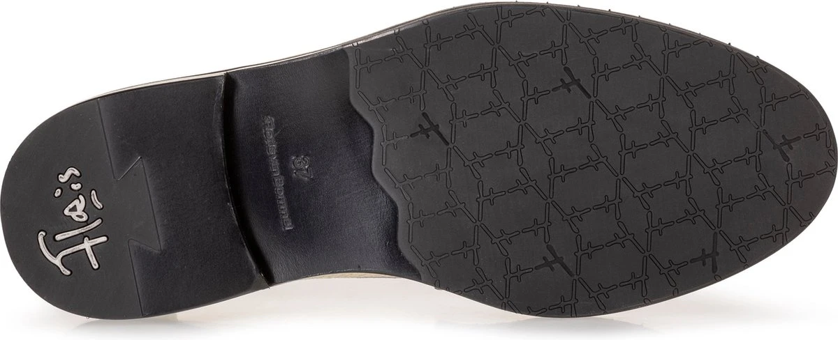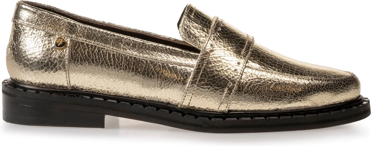 Deze loafer Sfw-40026 komt uit de collectie van het merk Floris Van Bommel. Dit model is gemaakt van goudkleurig craqueléleer, waardoor hij een opvallende en trendy look heeft. Een leuk detail is de band over de wReef die een elastiek inzetstuk heeft, zodat je de schoen nog even gemakkelijk aandoet. Toffe accenten zijn ook de merkstud op de zijkant van de hiel, de opstaande neusnaad en het reliëf op de zoolrand. Het binnenwerk is gemaakt van leer en het dempende voetbed is niet uitneembaar. Deze loafer heeft een hakje van bijna 3 centimeter hoog. Een opvallende schoen die straalt aan je voeten!