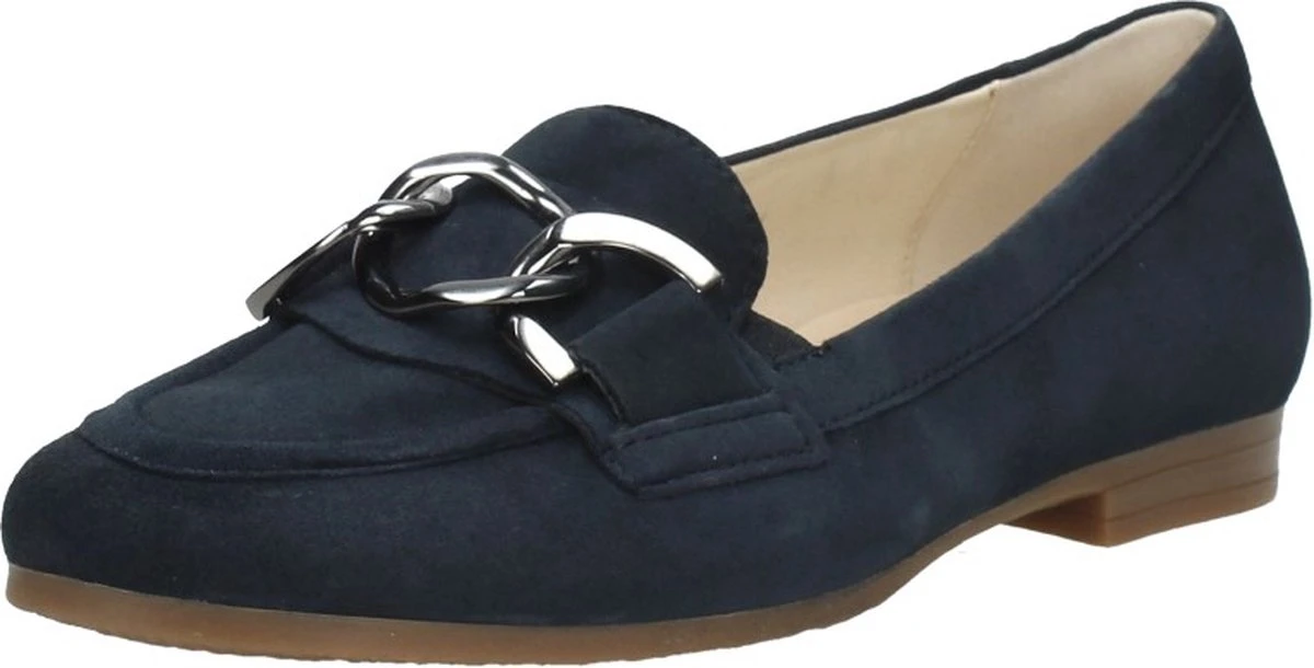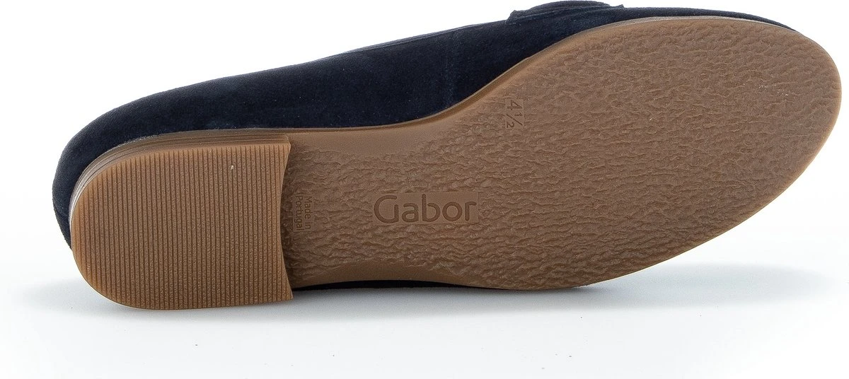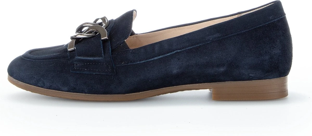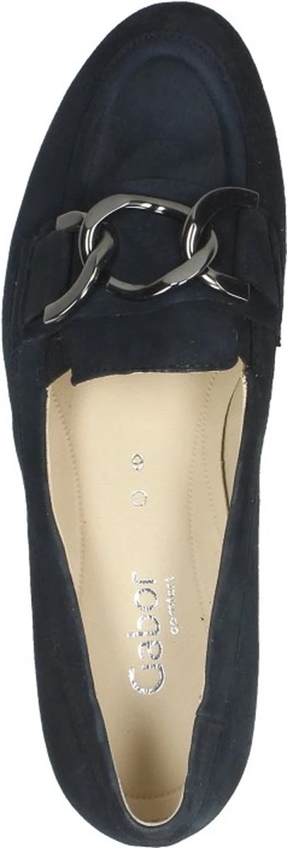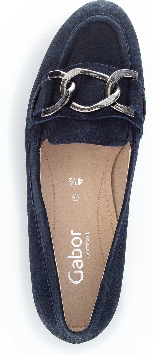 Deze donkerblauwe loafer komt uit de Comfort collectie van het merk Gabor. Comfort schoenen hebben meer volume bij de tenen en bij de bal van de voet en bieden voor iedere voet de noodzakelijke ruimte. Daarnaast zorgt deze loafer ervoor dat je de dag comfortabel doorkomt dankzij het suède bovenwerk, het zachte textiel binnenwerk en het vaste leren voetbed met een dempende werking zodat de gewrichten worden ontzien. Deze loafer zit niet alleen erg lekker maar ziet er ook nog eens super trendy uit door de donkere metallic schakelketting op de wReef en de opstaande neusnaad. Dit model heeft een normale G-wijdte en dankzij de elastische inzetten op de wReef heeft de instapper een ruime instap en een prettig loopcomfort. De amber bruine zool is uitzonderlijk flexibele, heeft een gripvast profiel voor een goede grip bij iedere stap en het lage blokhakje van 2 centimeter geeft hem die extra feminine look.