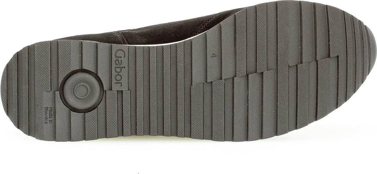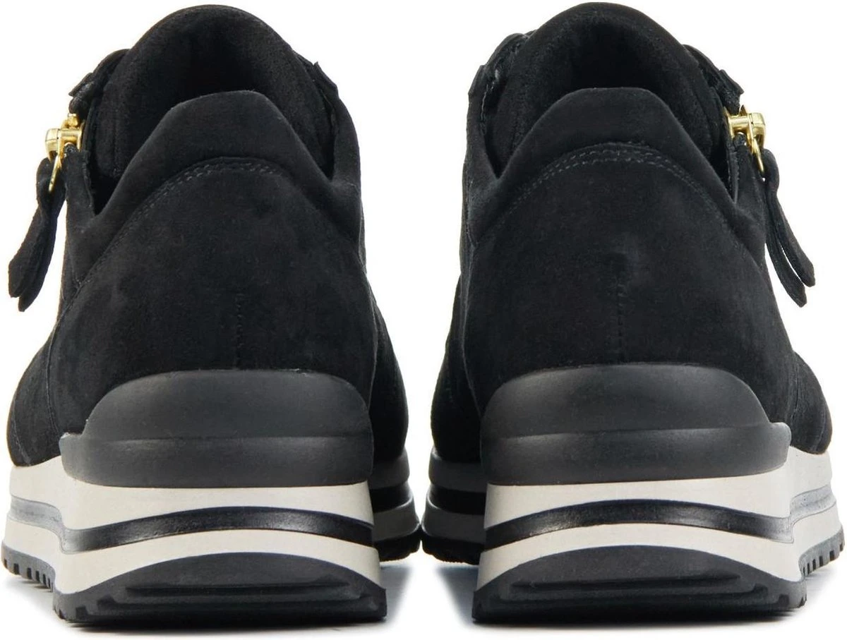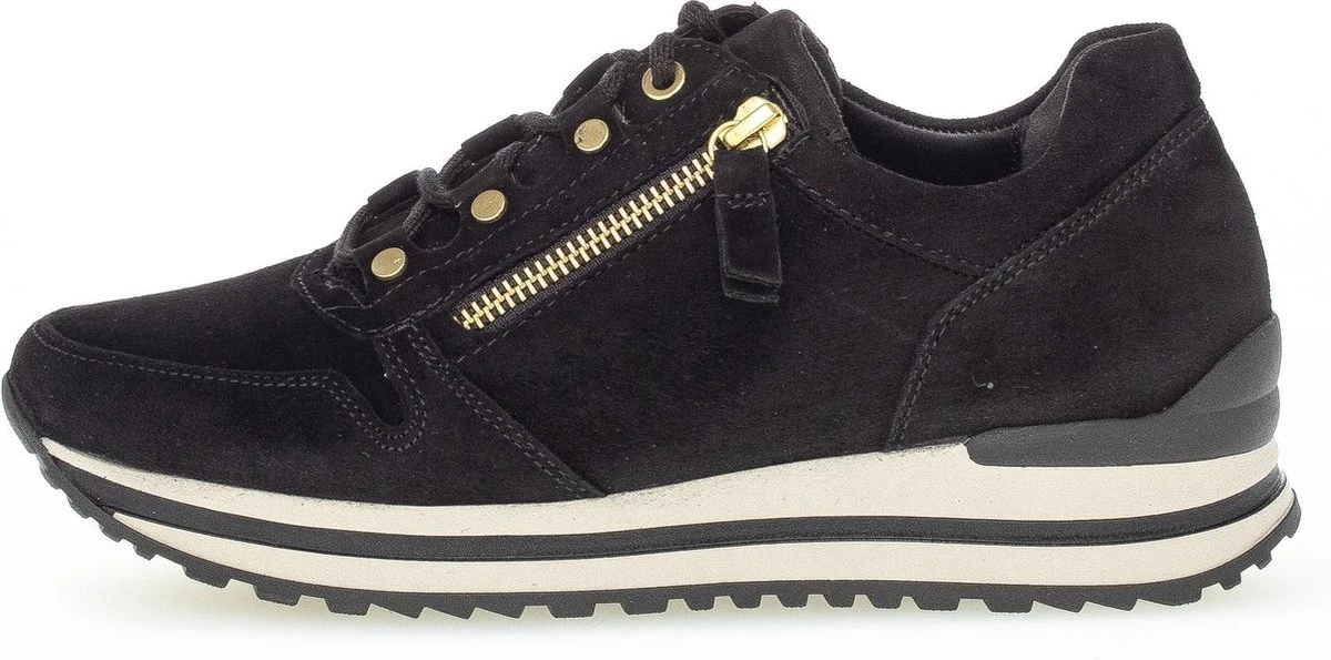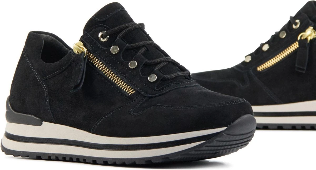 Deze zwarte Gabor sneakers zijn gemaakt van suède. De voering van de schoenen is gemaakt van textiel en de binnenzool van synthetisch materiaal. De sneakers zijn voorzien van verschillende inzetten, sierstiksels en gouden accenten. Door middel van de rits in combinatie met de veters trek je de sneakers gemakkelijk aan en uit. De schoenen zijn voorzien van een H-leest waardoor de tenen, bal en wreef van de voet extra ruimte hebben. Door deze H-leest en de opvallende, chunky zool zijn de sneakers extra comfortabel. De rubberen zool heeft een dikte van 2 centimeter. Het voetbed van deze zwarte Gabor sneakers is uitneembaar.