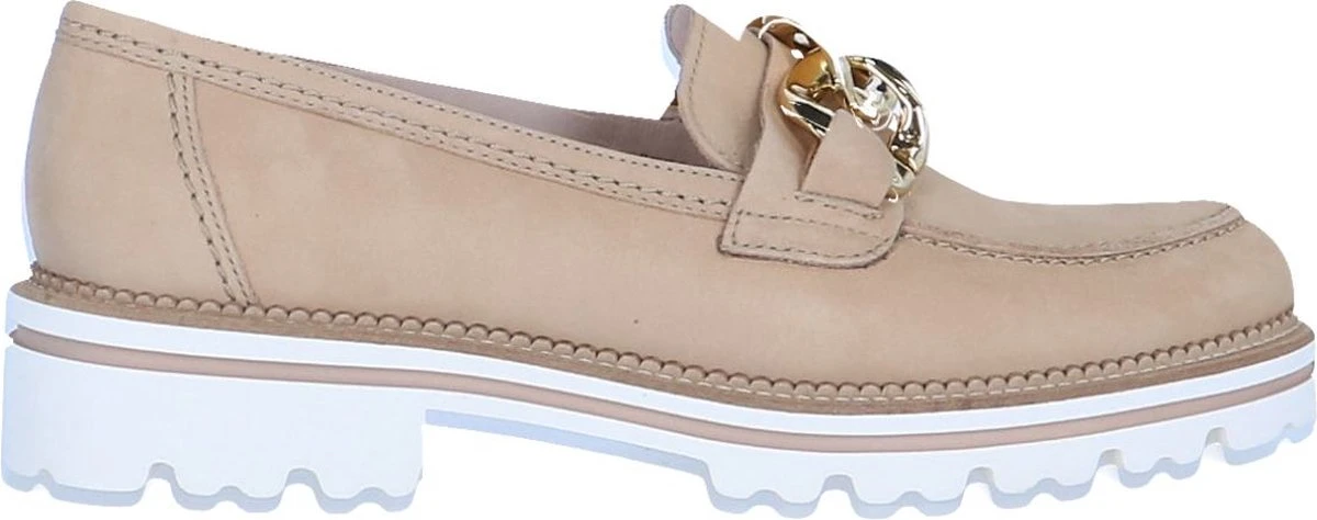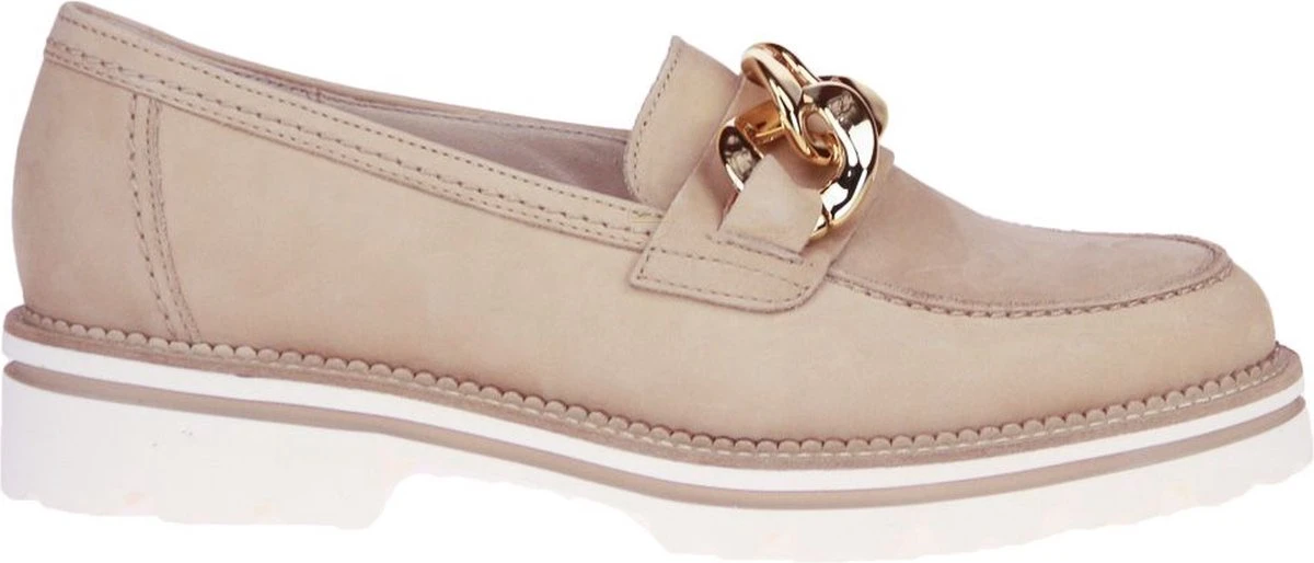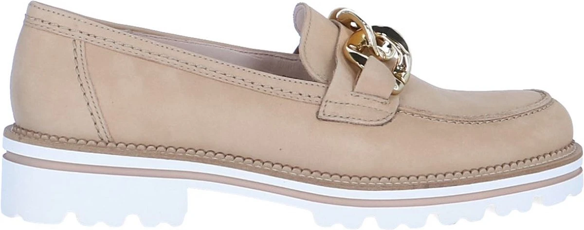 GABOR artikel/model 85.200.14 soft nubuk caramel (gold) zijn beige / camel kleurige damesschoenen mocassins – loafers uitgevoerd in beige of licht camel-bruin nubuckleder bovenmateriaal uit de nieuwe lente/zomer 2022 collectie van het Duitse schoenenmerk GABOR. Deze Gabor modieuze trendy loafer mocassin heeft een smal tot regular F-wijdte leest voor de gemiddelde voet en staat op een vederlichte uitgesproken getande crèmekleurige profielzool met een gekartelde bies erbovenop. Bovenop de wreef van de loafer ligt een opvallende goud metallic dikke ketting als decoratieve eyecatcher.