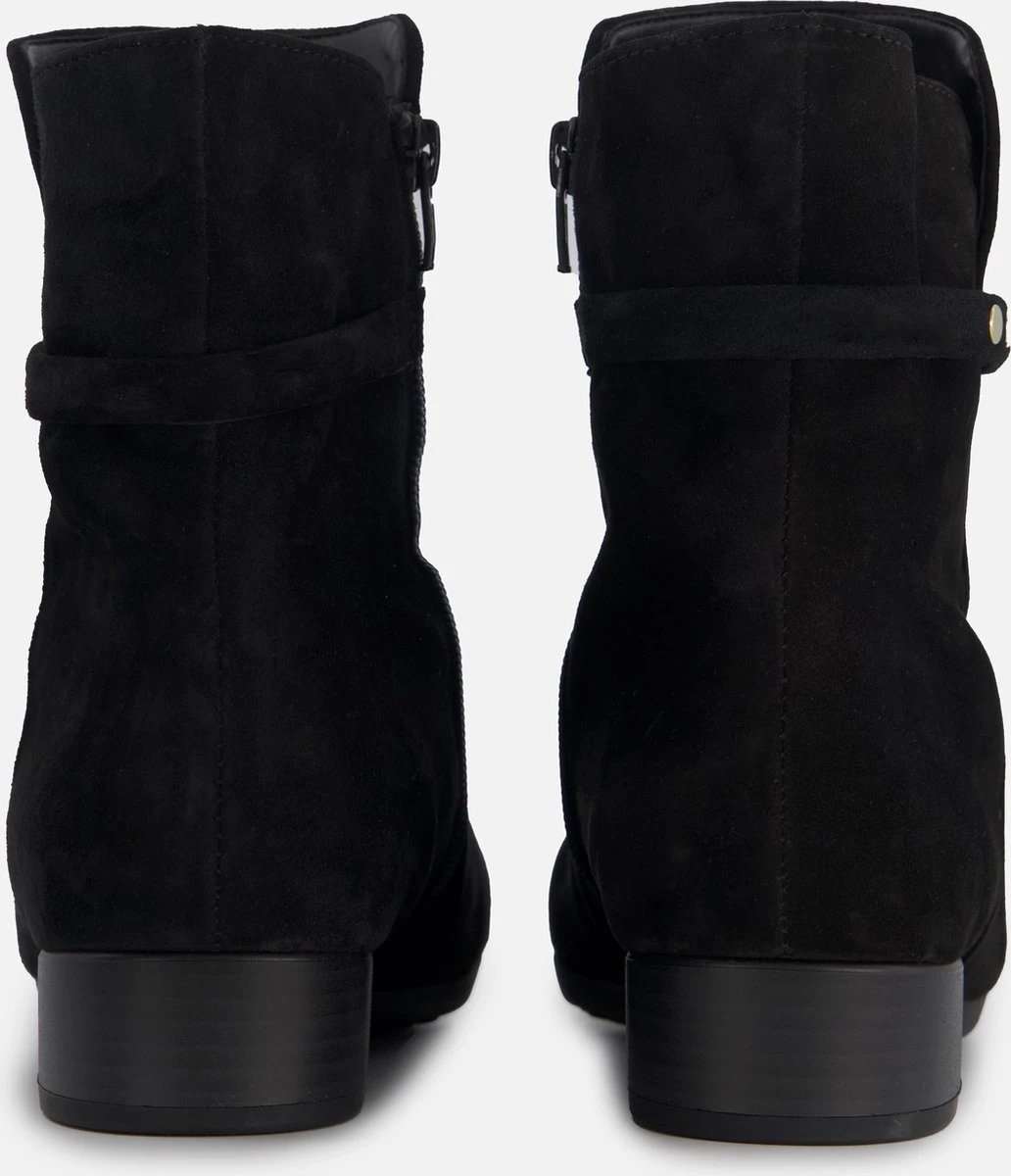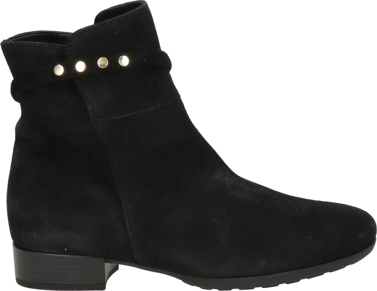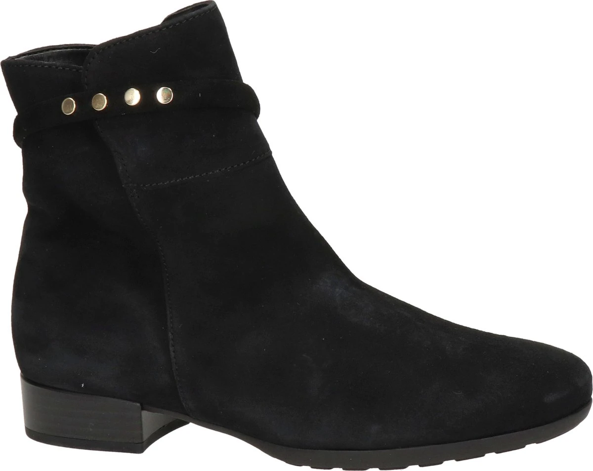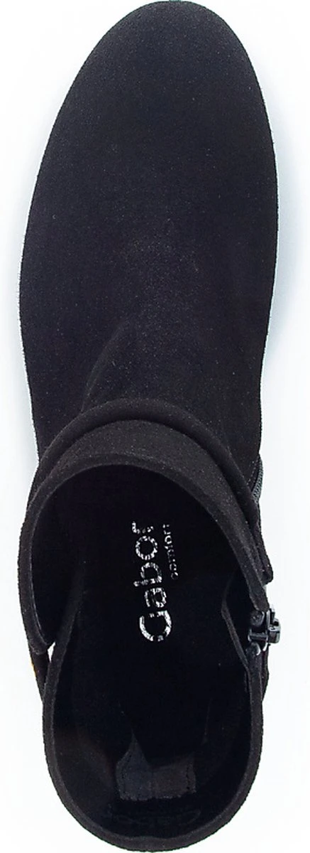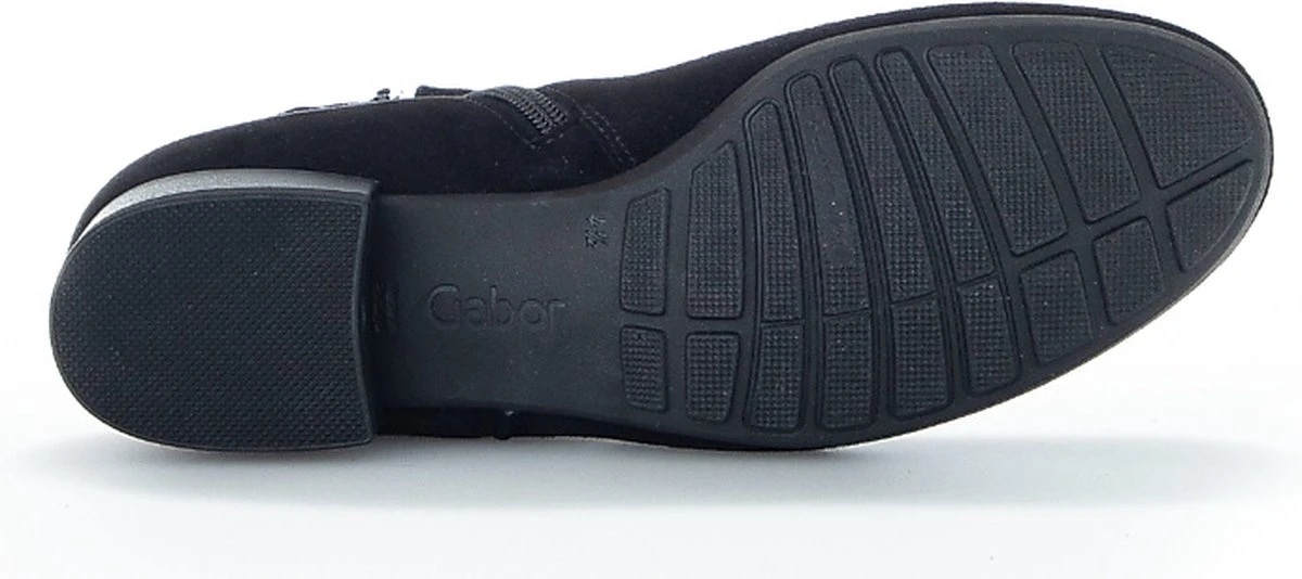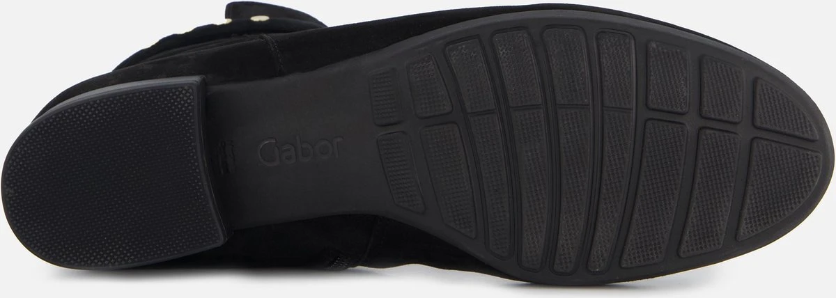 Suède enkellaars voor dames van het merk Gabor. Deze enkellaars met ronde neus is uitgevoerd in zwart suède. De binnenzijde van de schacht bevat een rits en rondom de schacht is een bandje aangebracht met goudkleurige studs. De binnenkant bestaat uit leer en een stevig contrefort draagt bij aan het draagcomfort. De rubberen loopzool heeft een grof profiel en de hak meet circa 2,5 cm.