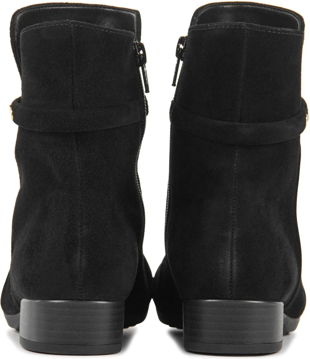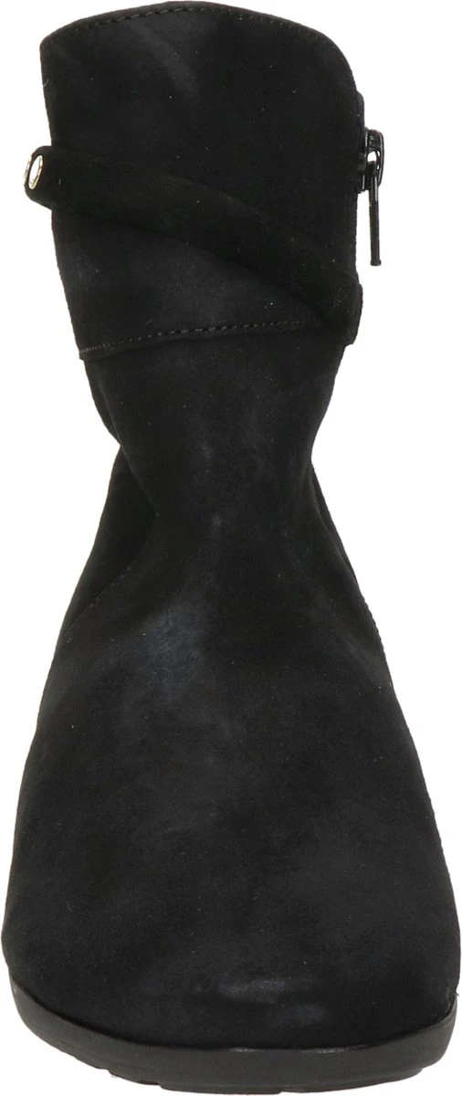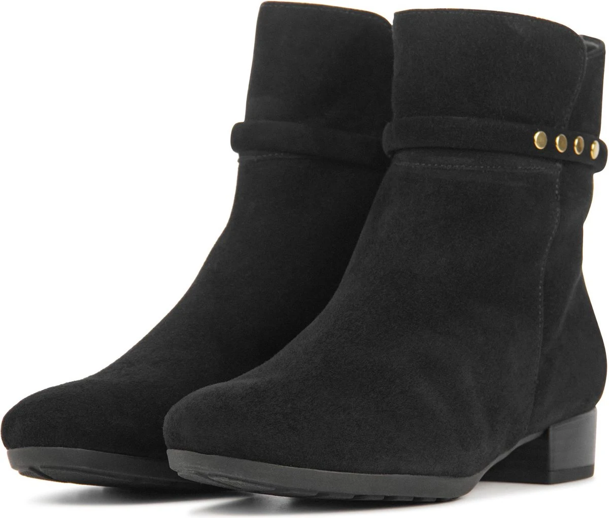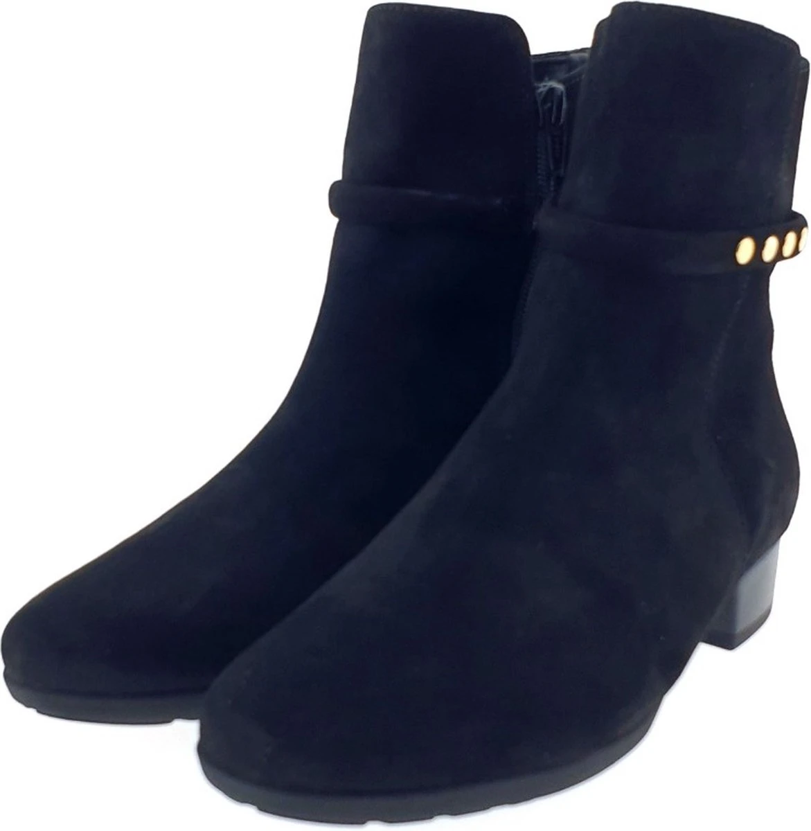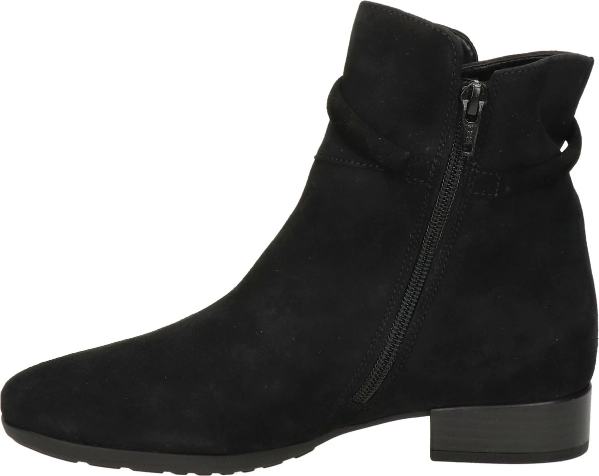 Suède enkellaars voor dames van het merk Gabor. Deze enkellaars met ronde neus is uitgevoerd in zwart suède. De binnenzijde van de schacht bevat een rits en rondom de schacht is een bandje aangebracht met goudkleurige studs. De binnenkant bestaat uit leer en een stevig contrefort draagt bij aan het draagcomfort. De rubberen loopzool heeft een grof profiel en de hak meet circa 2,5 cm.