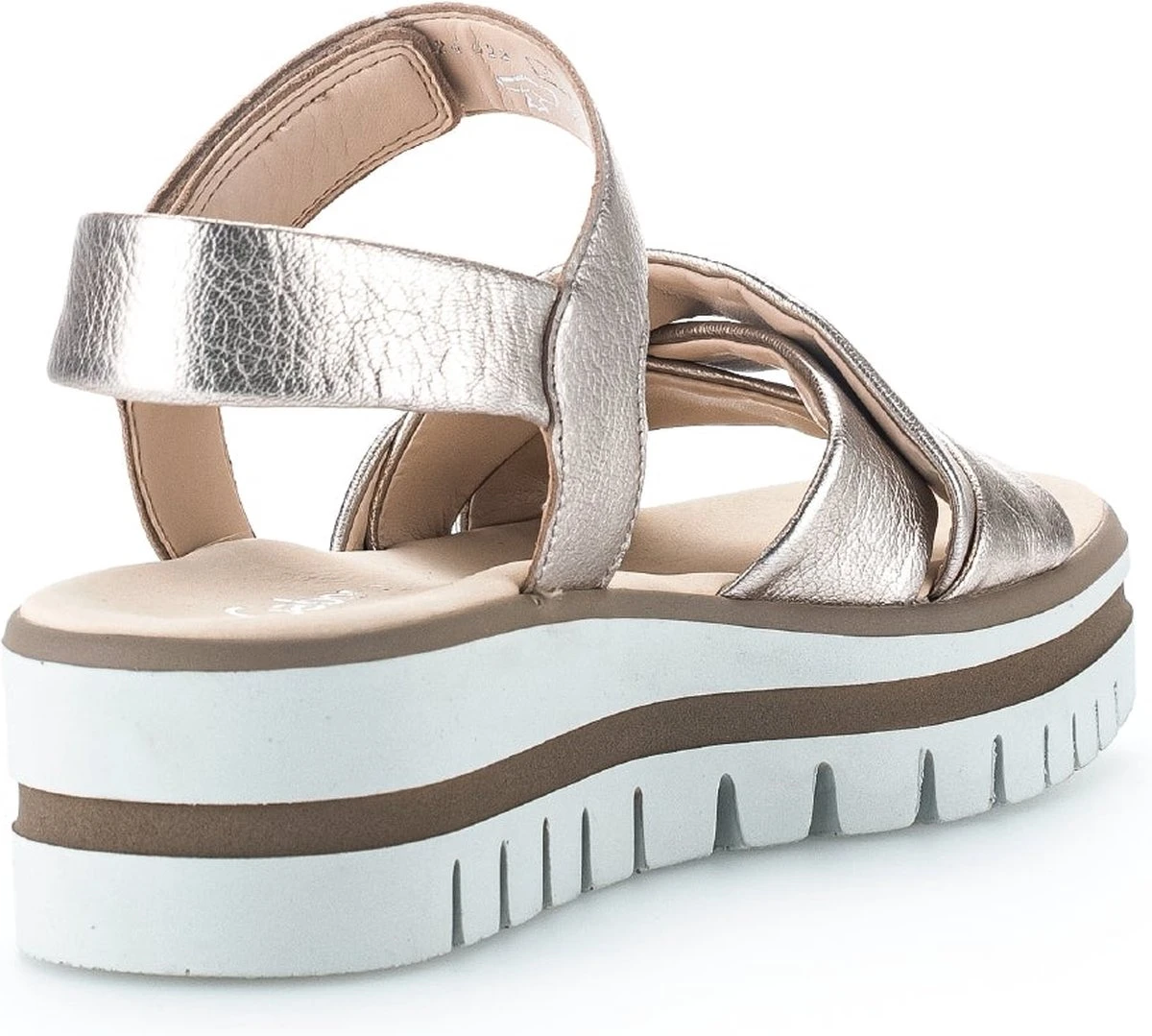 Deze Gabor sandalen in de kleur goud zijn gemaakt van leer. De voering en comfortabele binnenzool zijn ook van leer.De sandalen hebben een F-leest en een klittenbandsluiting. De zool is gemaakt van rubber en heeft een dikte van 3 centimeter.