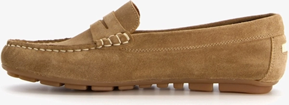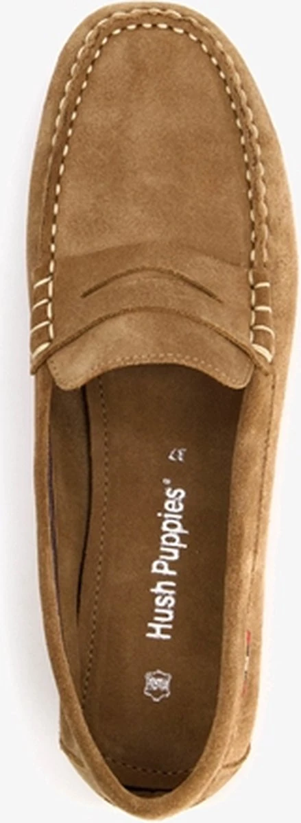 Bruine mocassins voor dames van Hush Puppies. Gemaakt van suède, een binnenwerk van leer en een stevige profielzool. De mocassins hebben een comfortabele instap en een comfortabel voetbed van leer. Deze is niet uitneembaar. De mocassins hebben stiksels op het bovenwerk en een rubberen zool.