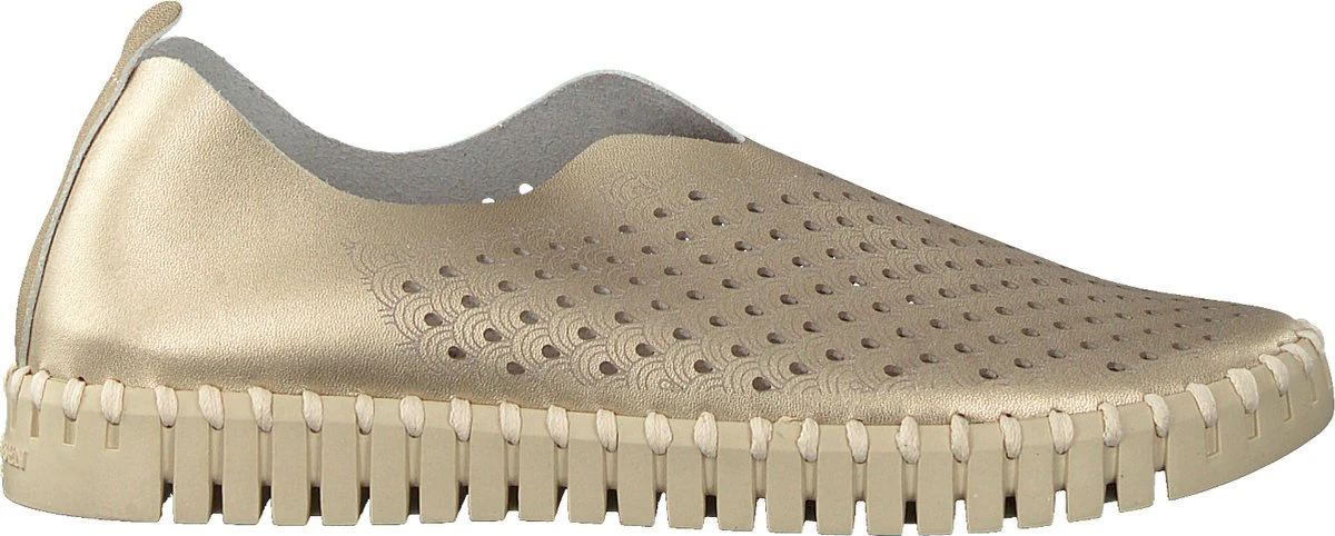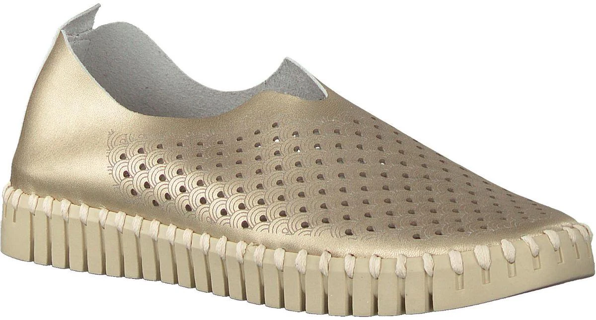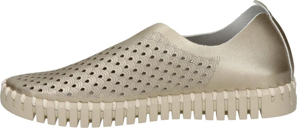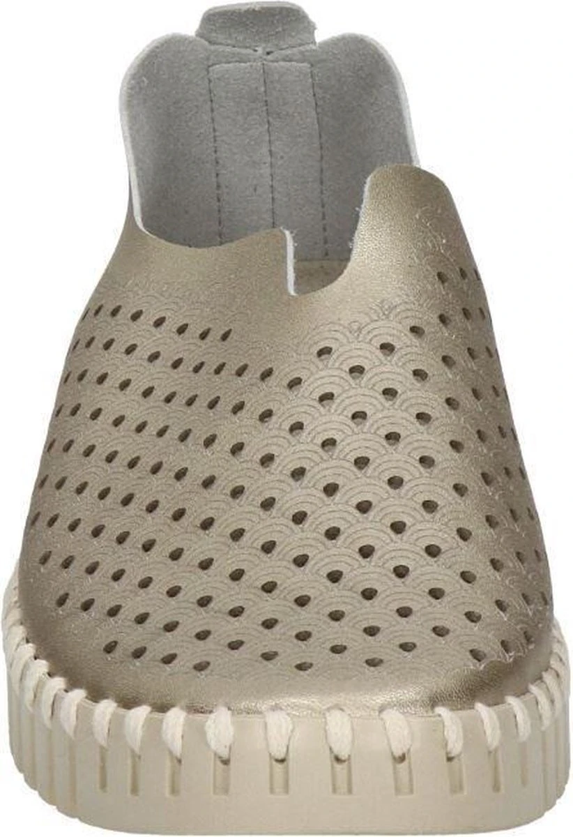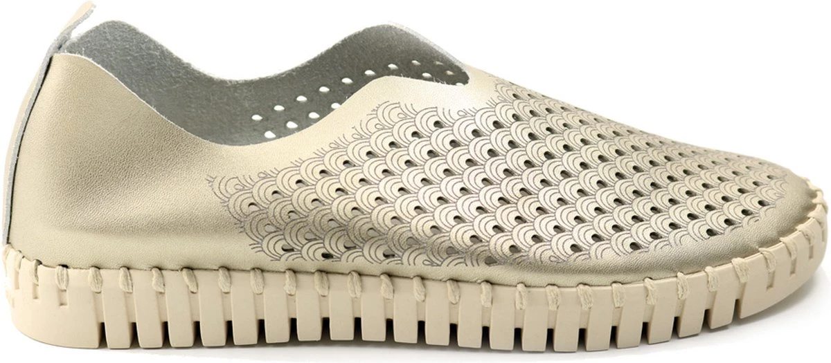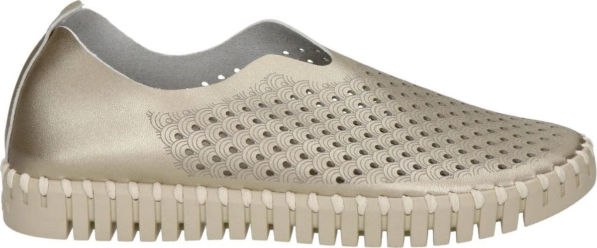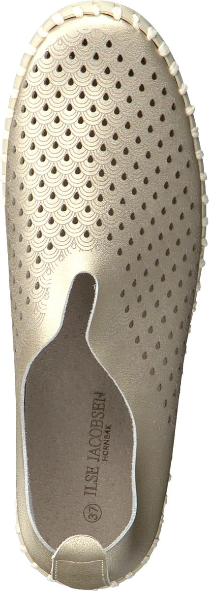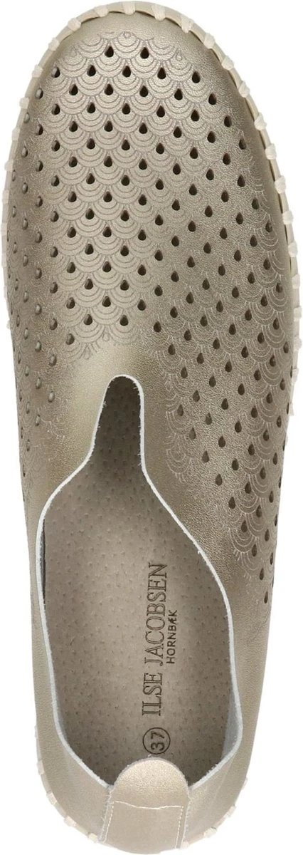 Ilse Jacobsen Tulip dames instapschoen. Deze stijlvolle metallic instapschoen van Ilse Jacobsen is een opvallende verschijning dankzij de rubberen zool met profiel en de grove steken van garen. Uitgevoerd in zacht en soepel gerecycled microvezel en voorzien van een gelaserd gaatjespatroon op het bovenwerk. Heeft een leder voetbed. De rubberen loopzool is zacht, flexibel en biedt een uitstekende grip. Let op! Het materiaal wordt nog soepeler met het dragen. Wij adviseren een maat kleiner te bestellen.