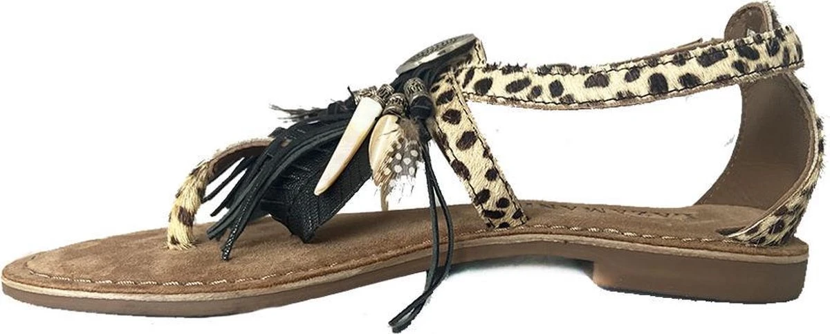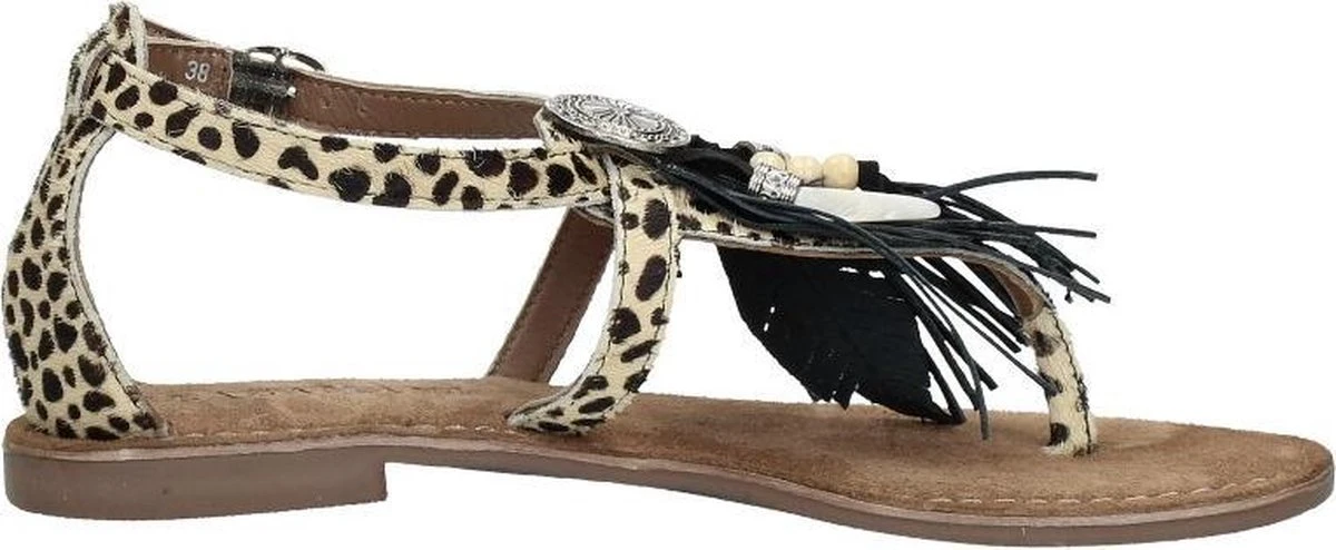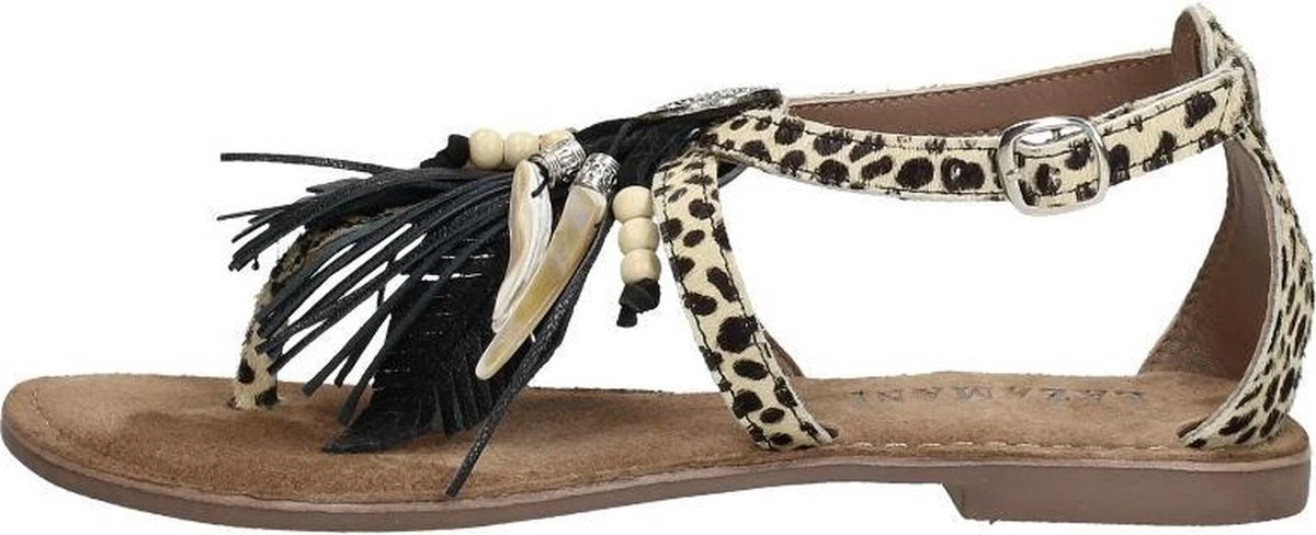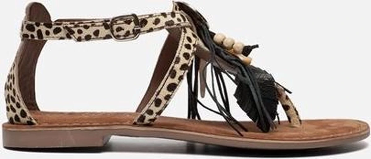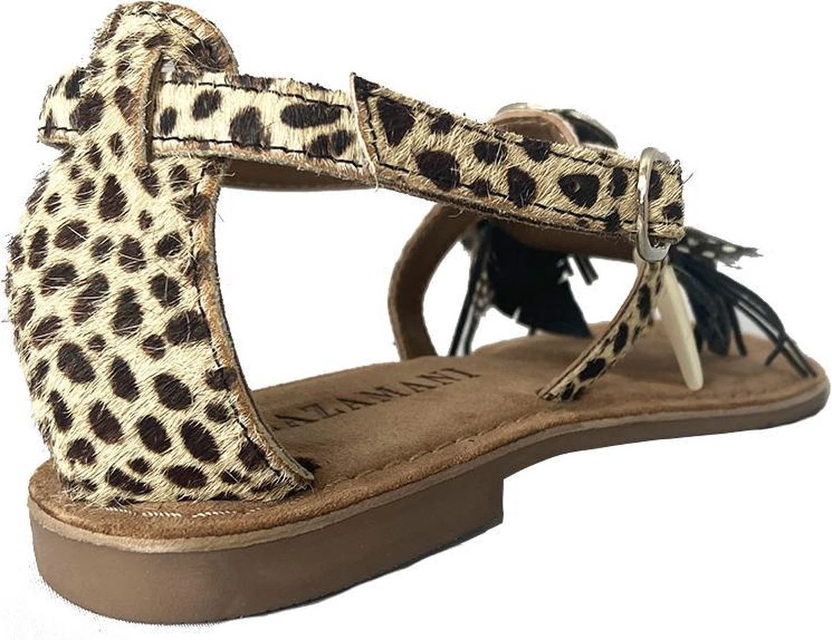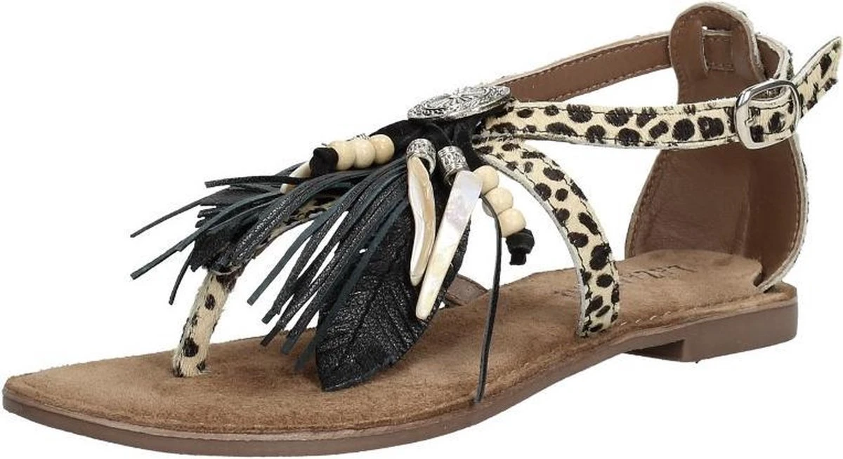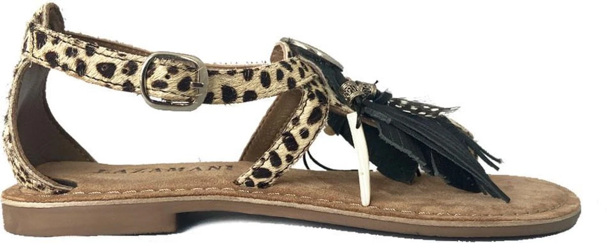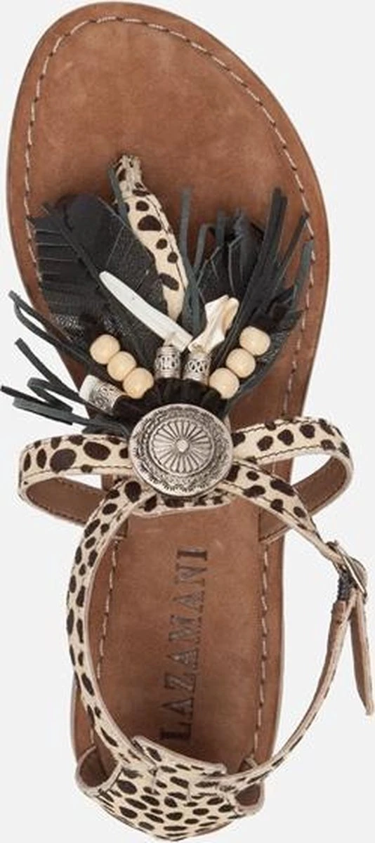 Deze sandalen uit de collectie van Lazamani zijn super trendy! De sandalen zijn gemaakt van leer en pony hair met een dierenprint. Op de wreef zijn de sandalen voorzien van een leuk detail met kralen, kwastjes en andere versieringen. De binnenzool is ook gemaakt van leer en voelt zacht aan voor optimaal loopcomfort. De rubberen zool is flexibel en zorgt voor grip. Deze heeft een dikte van 1 centimeter bij de hak. Met het gespje aan de buitenzijde zjin de beige Lazamani sandalen te sluiten.