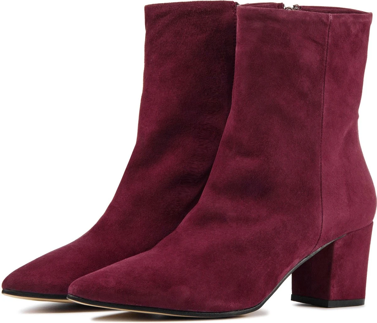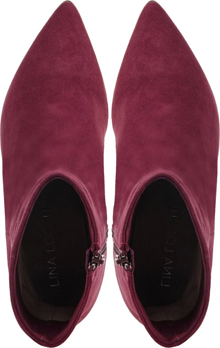 Suède enkellaars voor dames van het merk Lina Locchi. Deze enkellaars met spitse neus is uitgevoerd in bordeaux suède. De binnenzijde van de schacht heeft een rits om het aan- en uittrekken te versoepelen. De binnenkant is uitgevoerd in leer en een stevig contrefort draagt bij aan het loopgemak. De beklede hak meet circa 5 cm en de rubberen zool heeft een medium profiel.