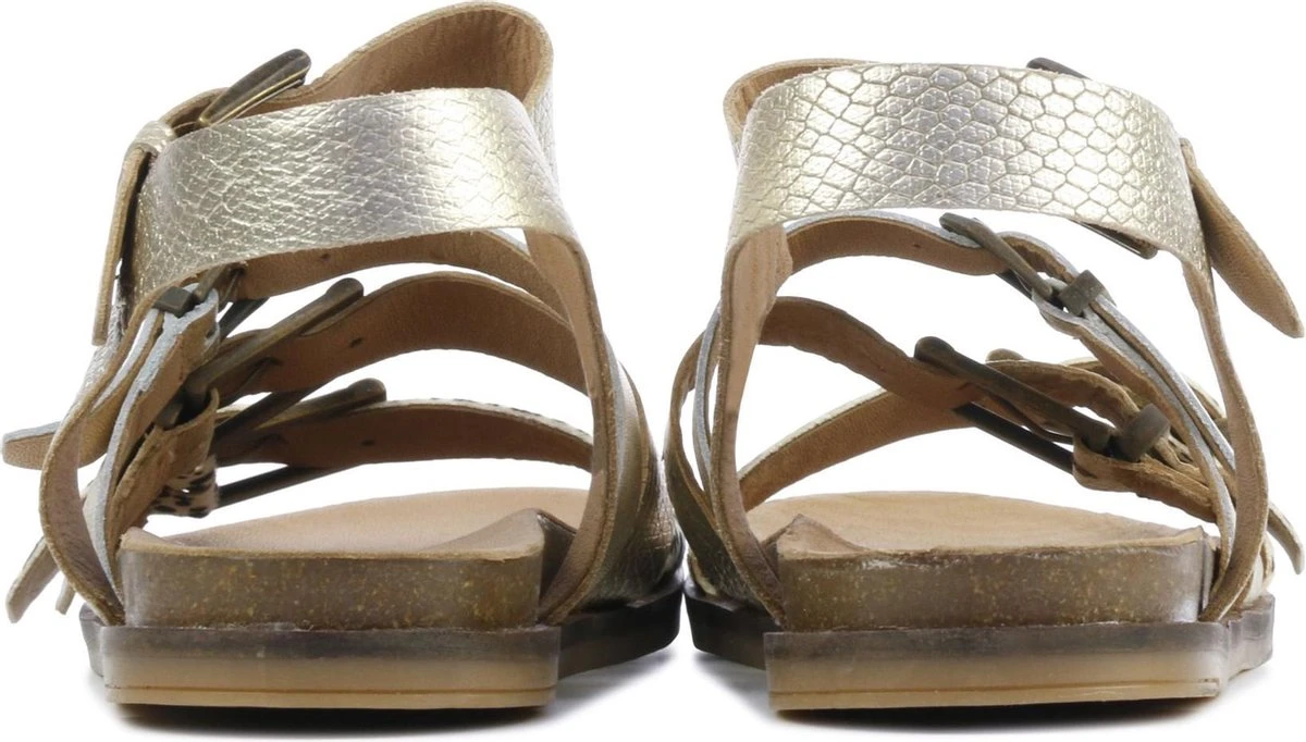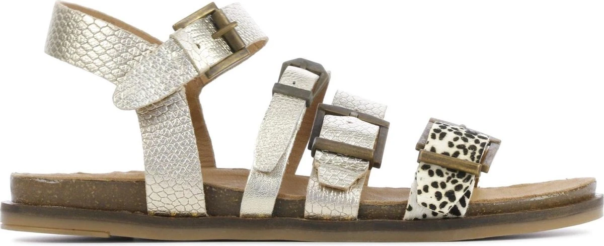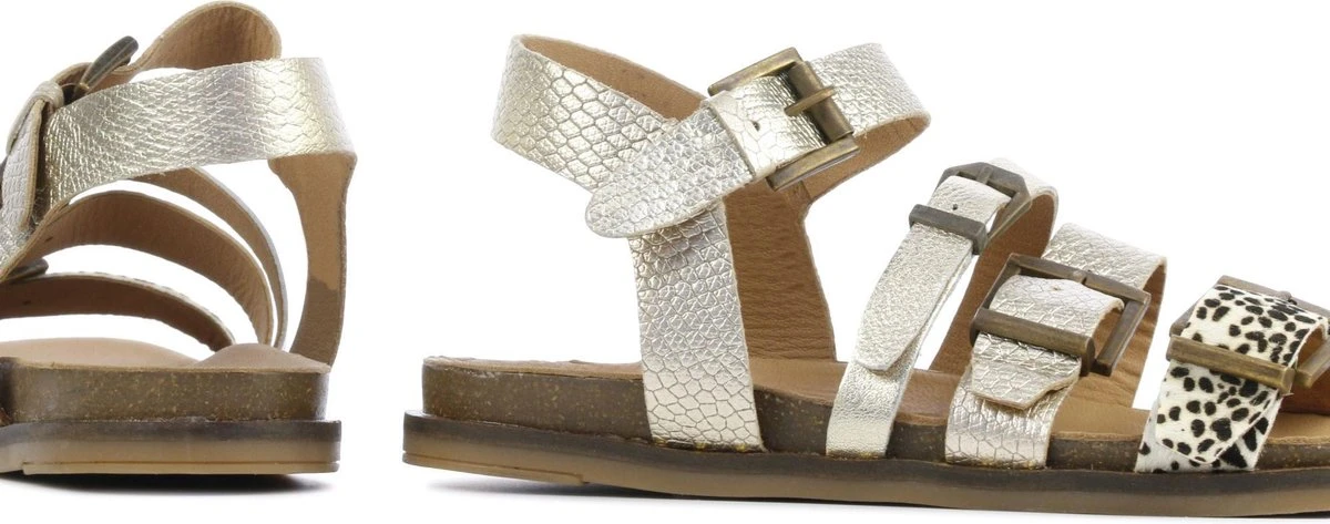 Sandaal met goud en dierenprint voor dames van het merk Lina Locchi. Deze sandaal met open neus heeft 3 horizontale bandjes met dierenprint en in de kleur goud, allemaal gesierd met een gesp. De band rondom de enkel heeft ook een gesp. De binnenkant is uitgevoerd in leer. De binnenzool heeft verhoogde randen voor een beter loopcomfort. De loopzool heeft een medium profiel voor stevige grip.