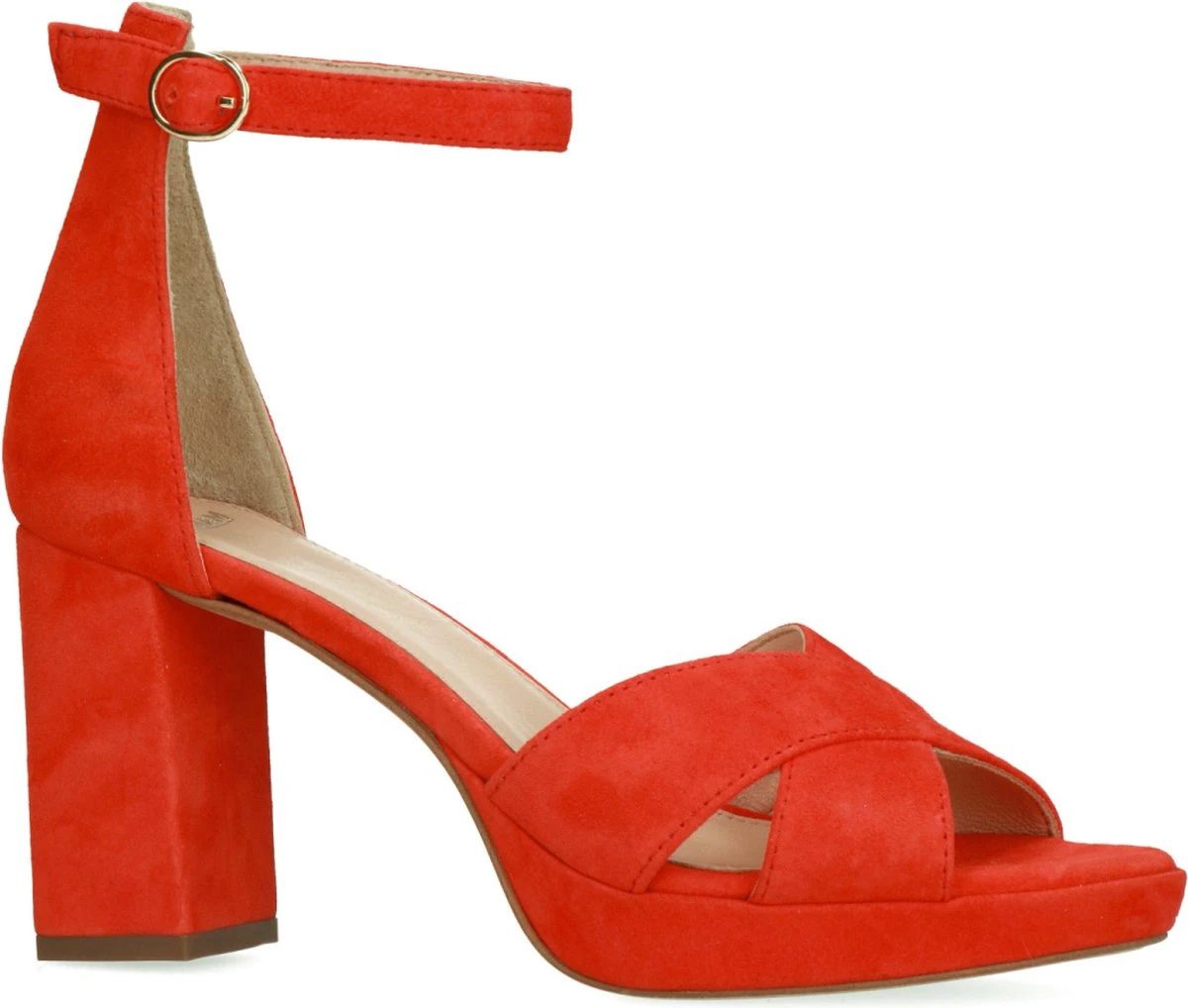 Met deze oranje suède sandalen met hak van Manfield ben je klaar voor het nieuwe seizoen. Deze open hakken zijn voorzien van suède gekruiste bandjes over de voet en een enkelbandje met goudkleurige gesp. De buitenkant is gemaakt van suède en de binnenkant van leer. We raden je daarom aan deze sandalen met hak goed te verzorgen met de suède/nubuck spray transparant. Deze pumps hebben een plateauzool van 1 cm hoog, welke samen gaat met een blokhak van 8 cm hoog.