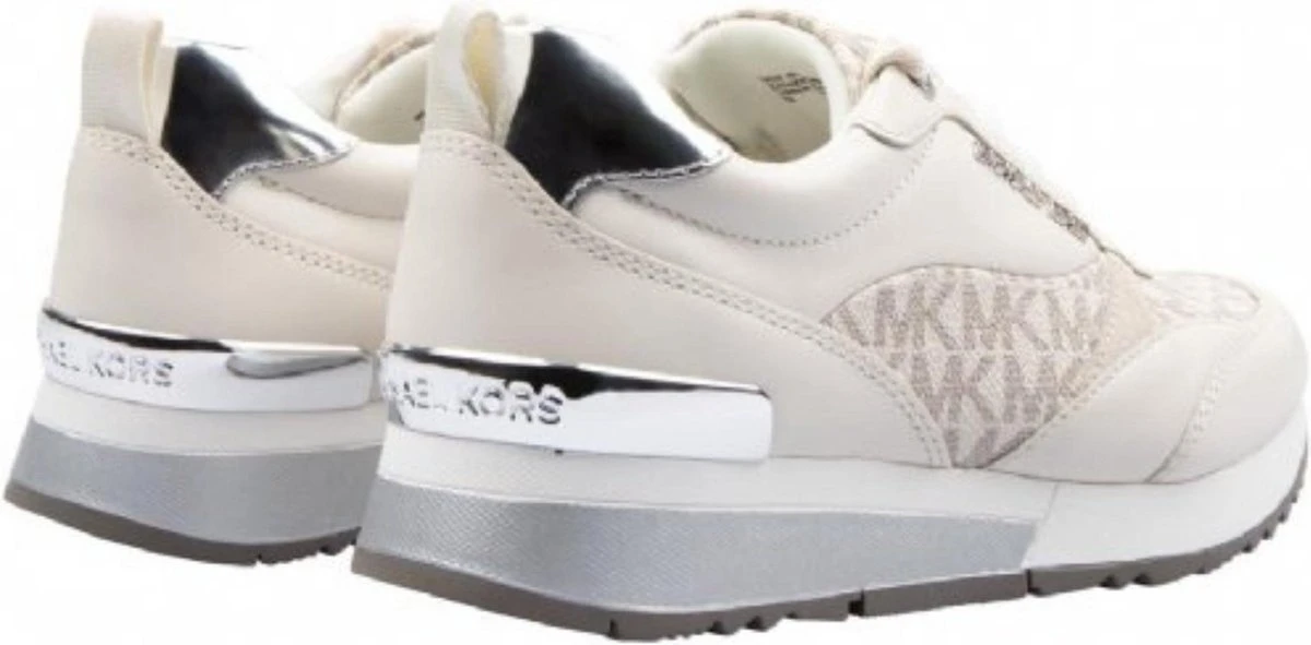 Michael Kors Allie Sneakers Ecru stride trainer – 132 Product Omschrijving Deze Dash sneakers van het Amerikaanse label Michael Kors zijn nu bij ons verkrijgbaar. De Dash sneakers zijn in een driekleur stelling uitgevoerd, hierdoor krijgen de sneakers een unieke look. Op de zijpanelen op de wreef van de sneaker is het iconische MK patroon zichtbaar in donkerbruin, terwijl er verder gespeeld wordt met witte en gouden accenten. Product Samenstelling Materiaal: Leer mix