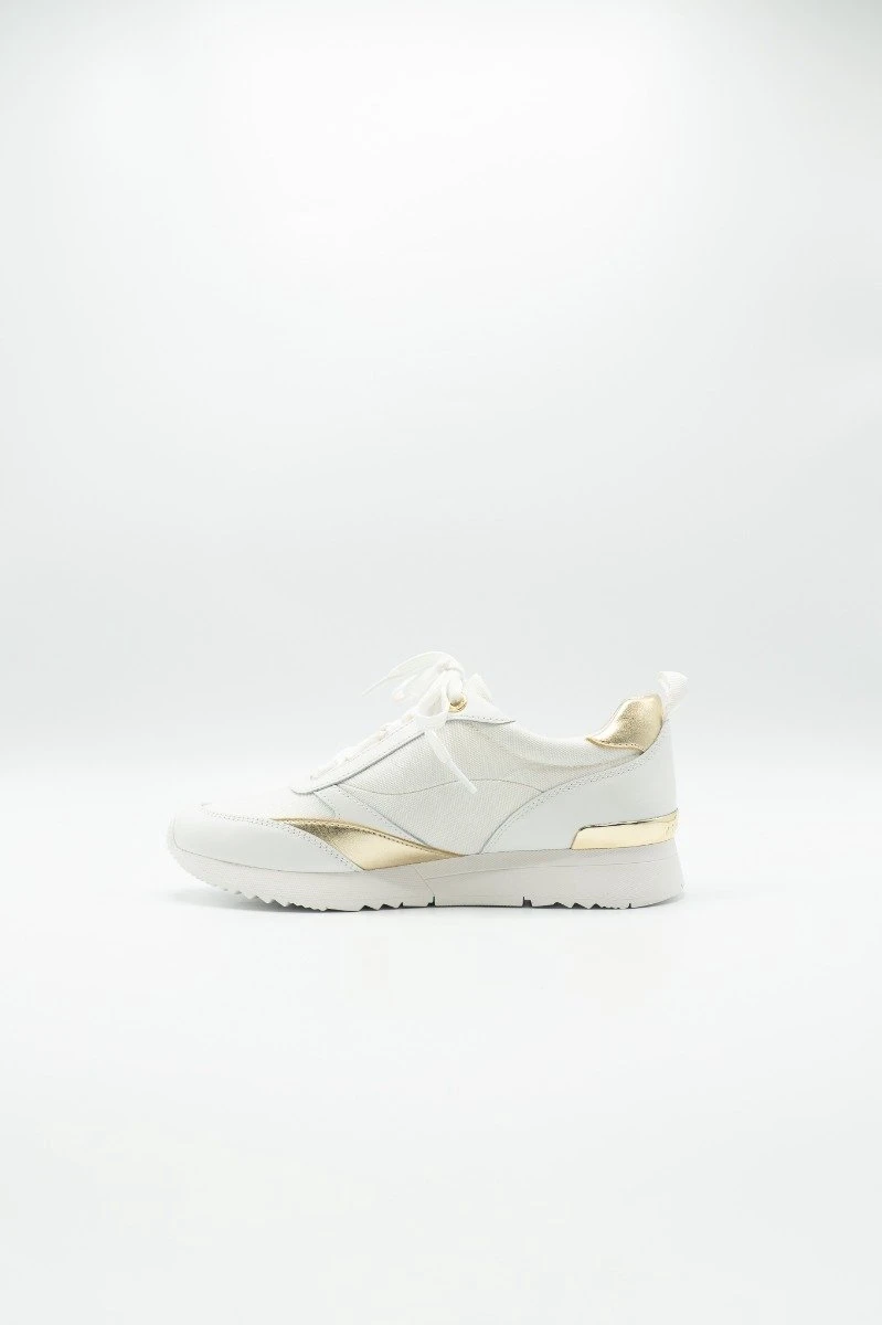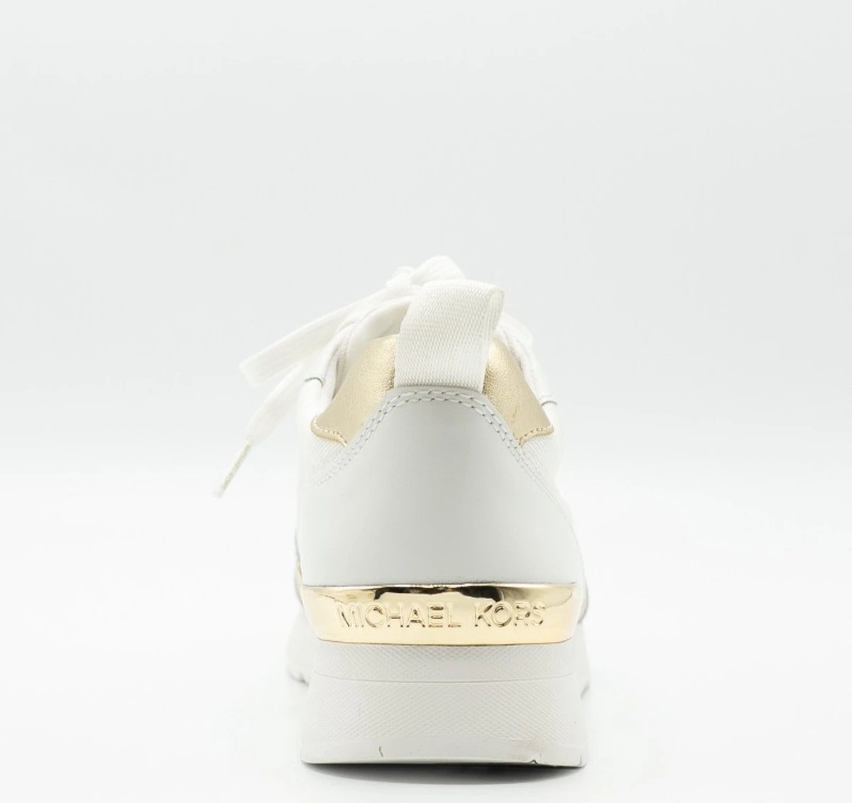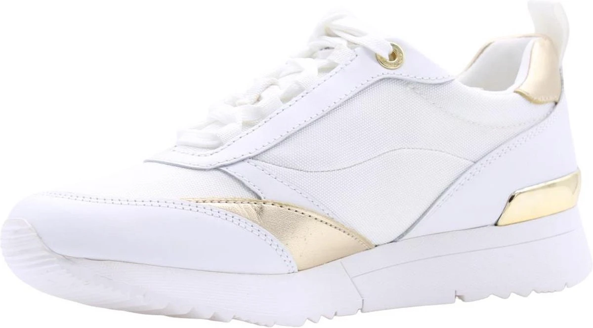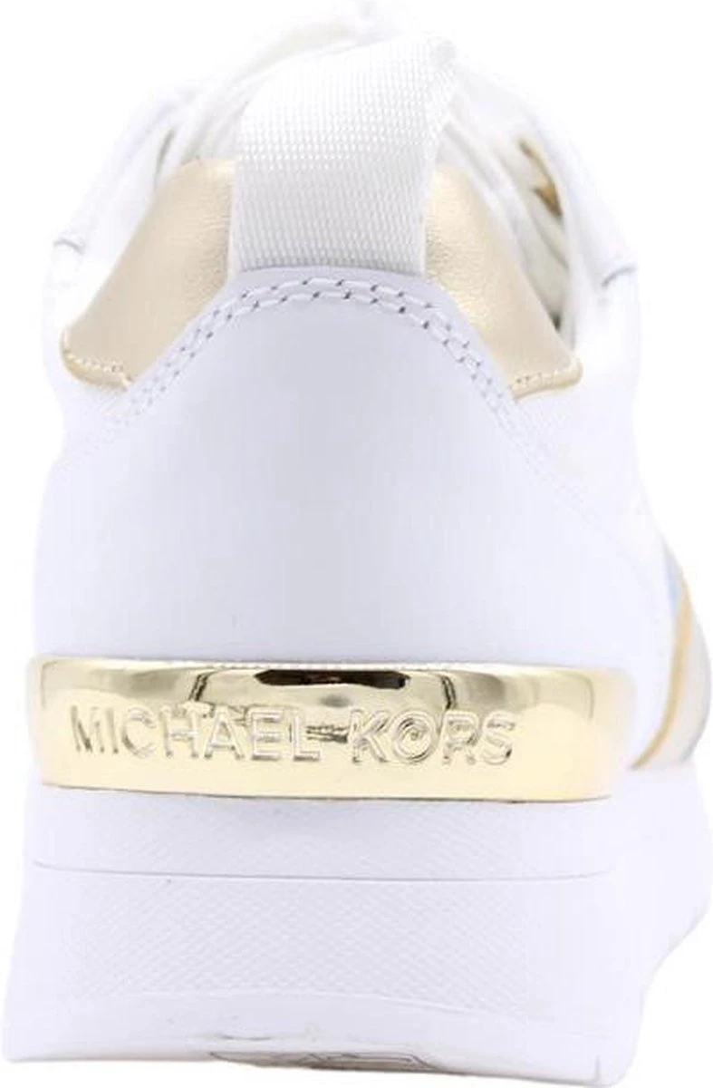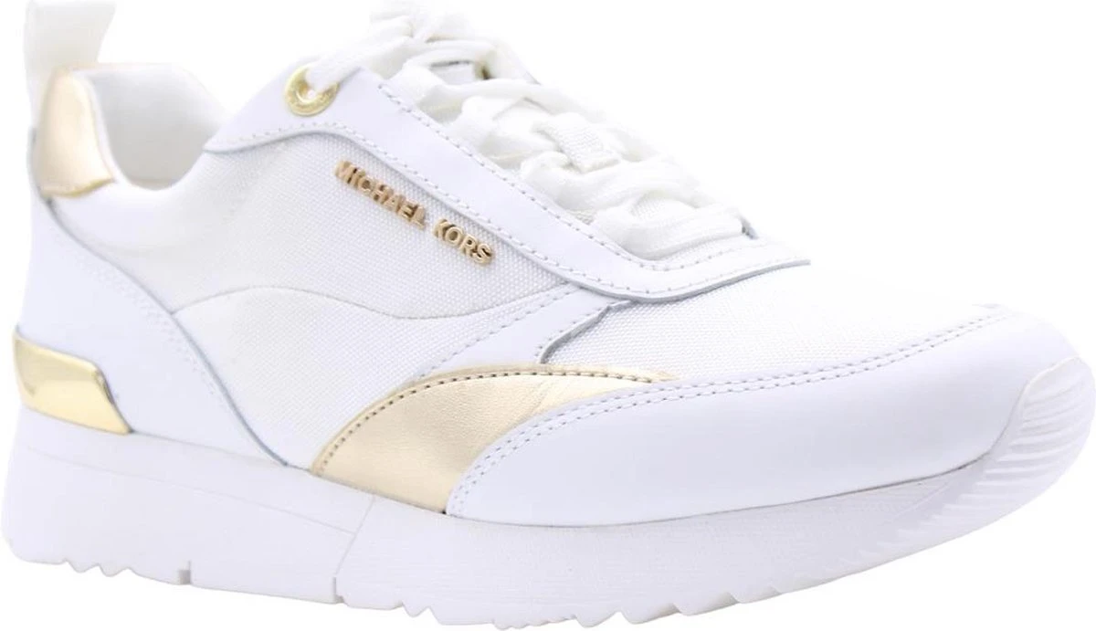 Allie Stride Trainer Sneaker De Allie Stride Trainer Sneaker uit de nieuwste collectie van Michael Kors. De sneakers zijn wit van kleur met goudkleurige details. De sneakers zijn voorzien van een vetersluiting, een merklogo op de zijkant en goudkleurige details op de hiel. Combineer met andere items uit de collectie voor de complete look.