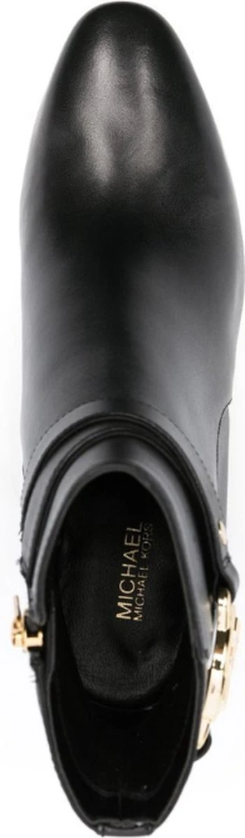 Leuke zwart leren enkellaarzen met gouden merklogo op de enkel uit de nieuwe collectie van Michael Kors. Super nette hak en is makkelijk te combineren met elke outfit.