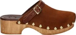 Nelson dames clog. Een instapper zoals deze kan niet gemist worden in jouw collectie! De buitenkant is volledig van suede en afgewerkt met gouden studs. De gesp is niet verstelbaar. Het binnenmateriaal is van imitatieleer. Het voetbed is van leer en biedt een lichte demping tijdens het lopen. De loopzool is van rubber.