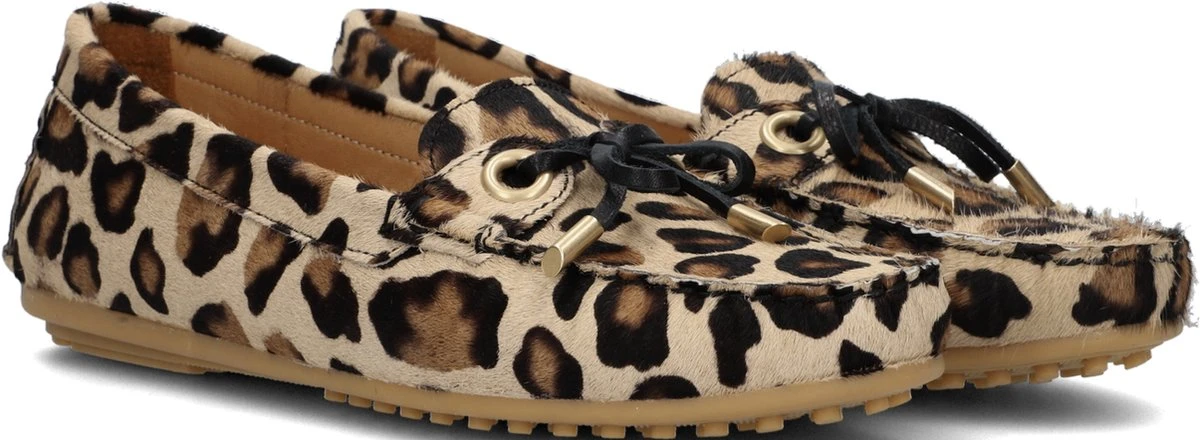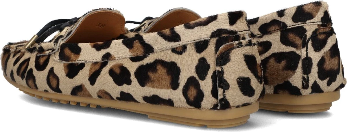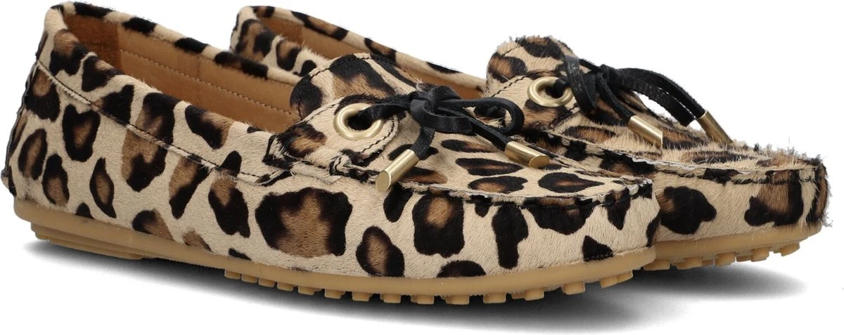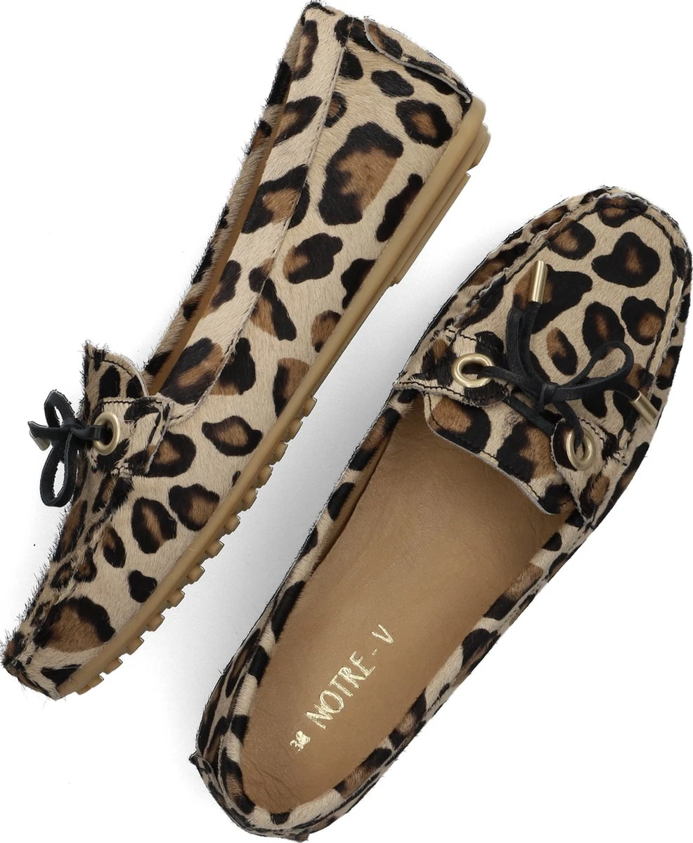 De elegante Italiaanse ontwerpen van het merk Notre-V zijn er voor de verfijnde vrouw die er graag effortless chic uit wil zien. De producten zijn gemaakt van luxe materialen met subtiele accenten en een knipoog naar de laatste trends. Met deze klassieke mocassin 03-014-12 maak jij je outfit af en zorg je voor een elegante touch. De buitenkant is uitgevoerd in beige ponyhair met animalprint en heeft een mooi en eenvoudig silhouet. De voering is gemaakt van leer met een vast voetbed. Deze schoen heeft een veter door de bovenkant met metalen veterringen een een strik op de neus. De opstaande naad met stoere stiksels maakt deze mocassin extra stijlvol. De zool met nopjesprofiel is van rubber en zorgt voor goede grip. Combineer deze schoen onder je favoriete jeans of onder een leuk rokjes of jurkje!