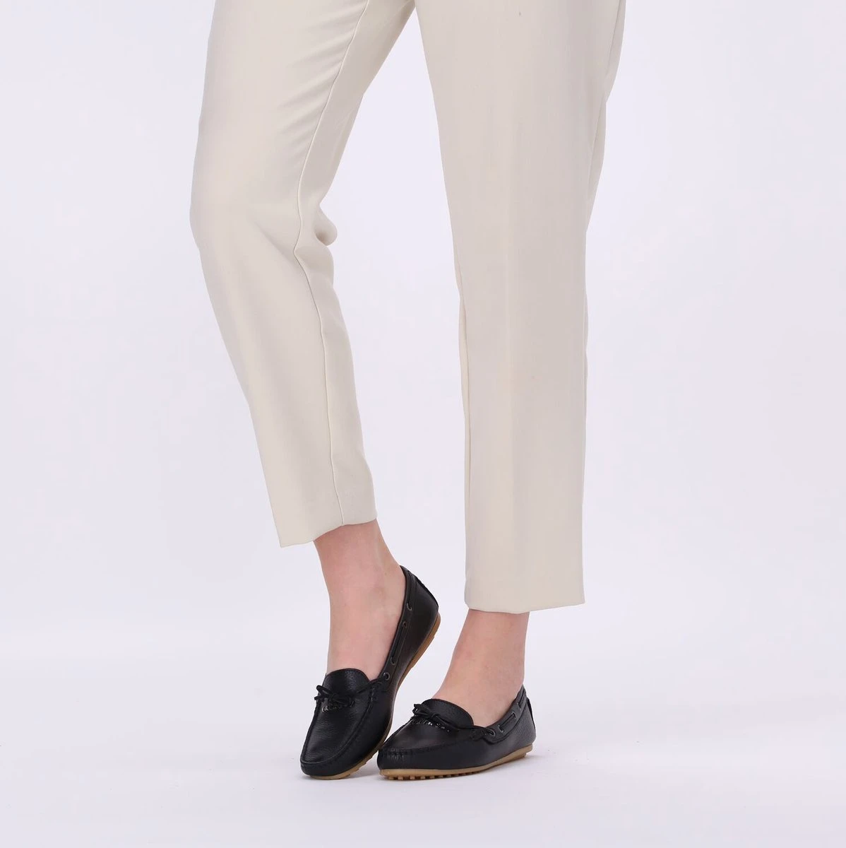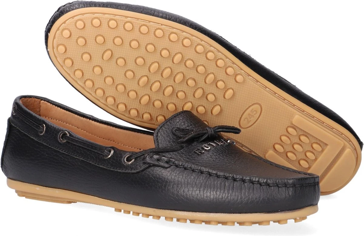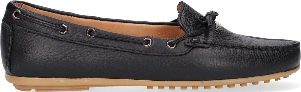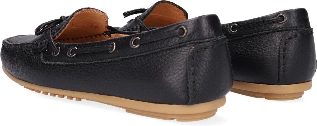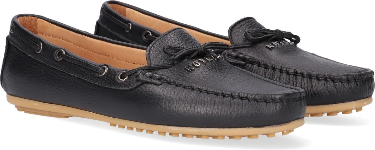 De elegante Italiaanse ontwerpen van het merk Notre-V zijn er voor de verfijnde vrouw die er graag effortless chic uit wil zien. De producten zijn gemaakt van luxe materialen met subtiele accenten en een knipoog naar de laatste trends. Met deze klassieke mocassin 03-N59 maak jij je outfit af en zorg je voor een elegante touch. De buitenkant is uitgevoerd in zwart leer en heeft een mooi en eenvoudig silhouet met een merkembleem op de wReef. De voering is gemaakt van leer met een vast voetbed. Deze schoen heeft een veter door de bovenkant met metalen veterringen een een strik op de neus. De opstaande naad met stoere stiksels maakt deze mocassin extra stijlvol. De zool met nopjesprofiel is van rubber en zorgt voor goede grip. Combineer deze schoen onder je favoriete jeans of onder een leuk rokjes of jurkje!