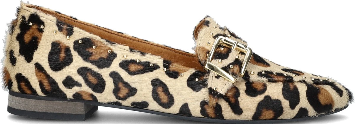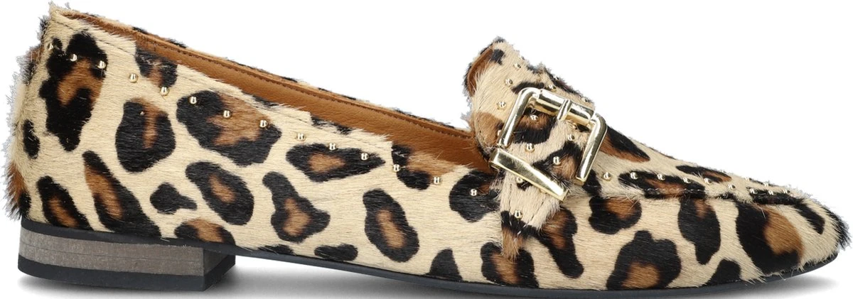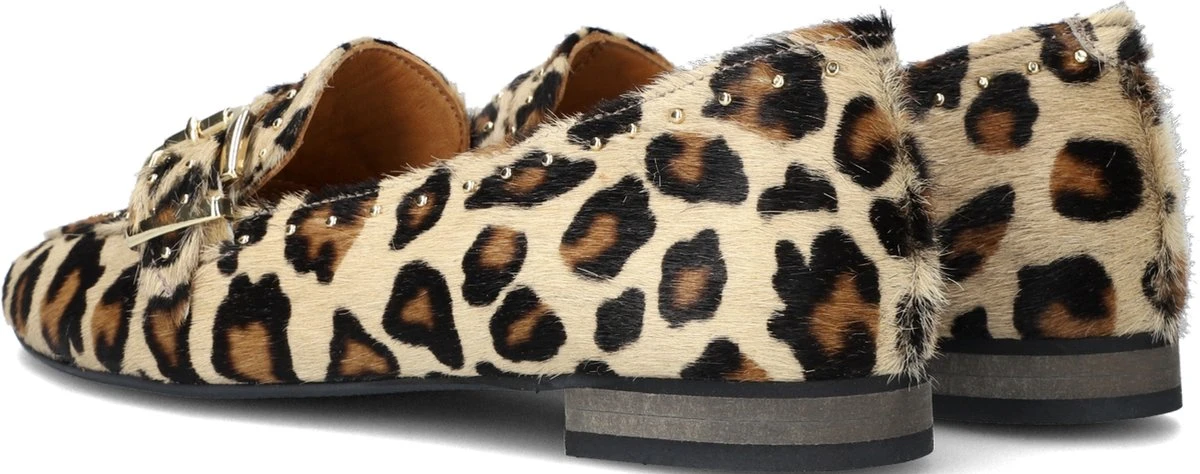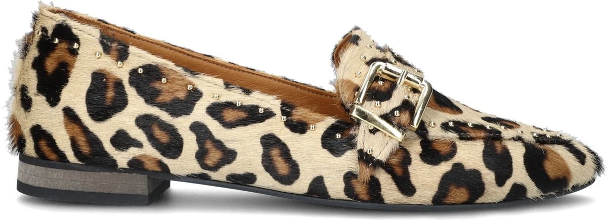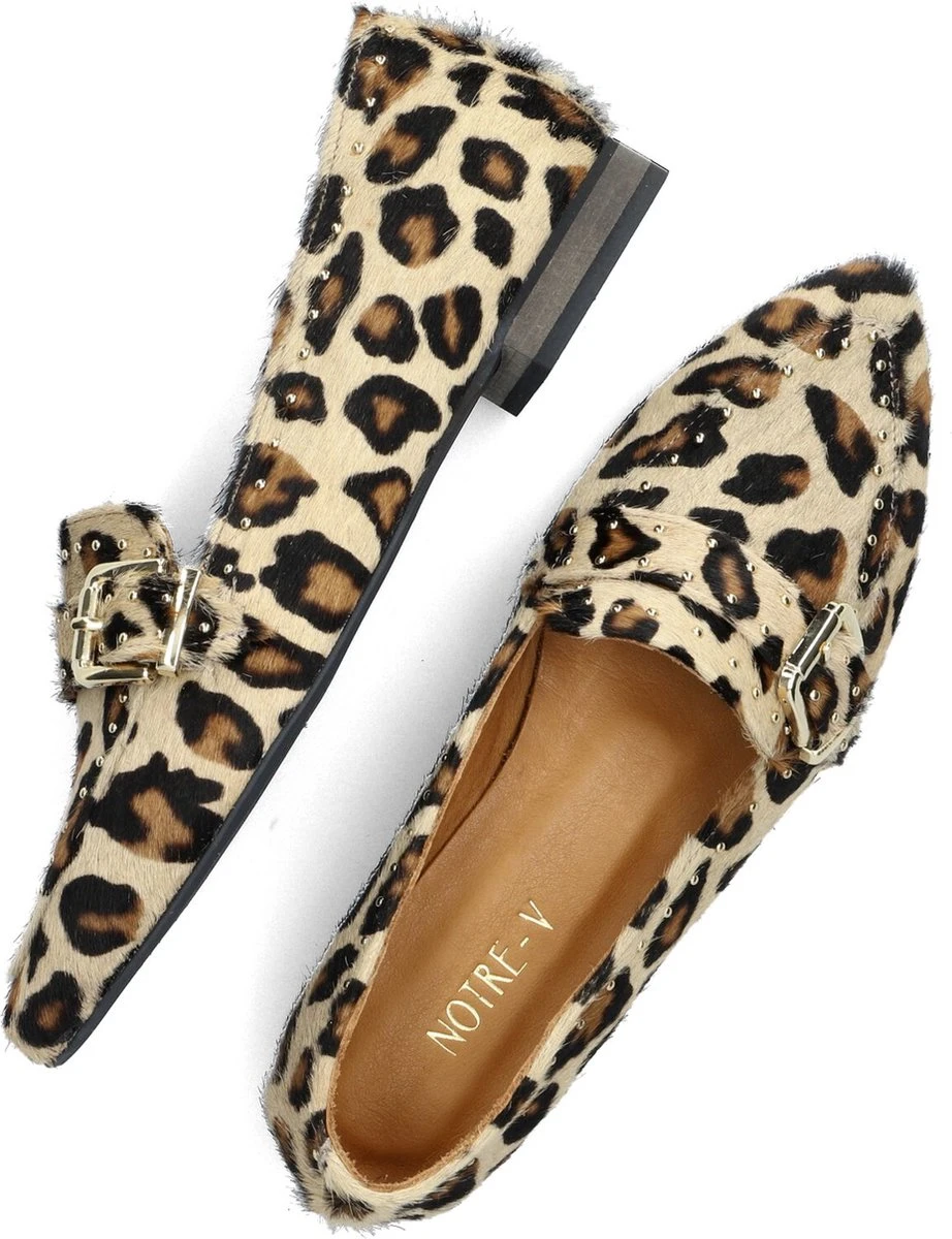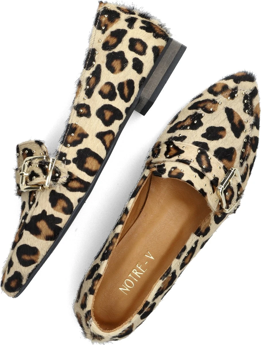 De elegante Italiaanse ontwerpen van het merk Notre-V zijn er voor de verfijnde vrouw die er graag effortless chic uit wil zien. De producten zijn gemaakt van luxe materialen met subtiele accenten en een knipoog naar de laatste trends. Met deze klassieke loafer 20046-02 maak jij je outfit af en zorg je voor een stoere touch. De buitenkant is uitgevoerd in beige ponyhair met animalprint en heeft een mooi en stijlvol silhouet. De voering is gemaakt van leer met een vast dempend voetbed en een hielstuk van suède voor extra comfort. Deze schoen heeft een afwerking van goudkleurige bolstuds op de enkelkraag, neus en op de wReefband met op de wReef ook nog een goudkleurige siergesp. De gladde zool is gemaakt van rubber en heeft een gelaagd blokhakje van 2 centimeteer voor een vrouwelijke touch. Combineer deze schoen onder je favoriete jeans of onder een leuk rokjes of jurkje!