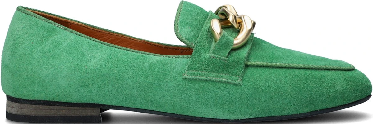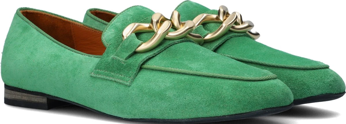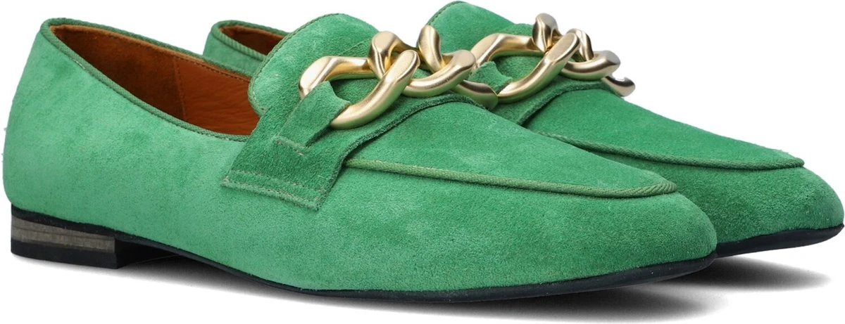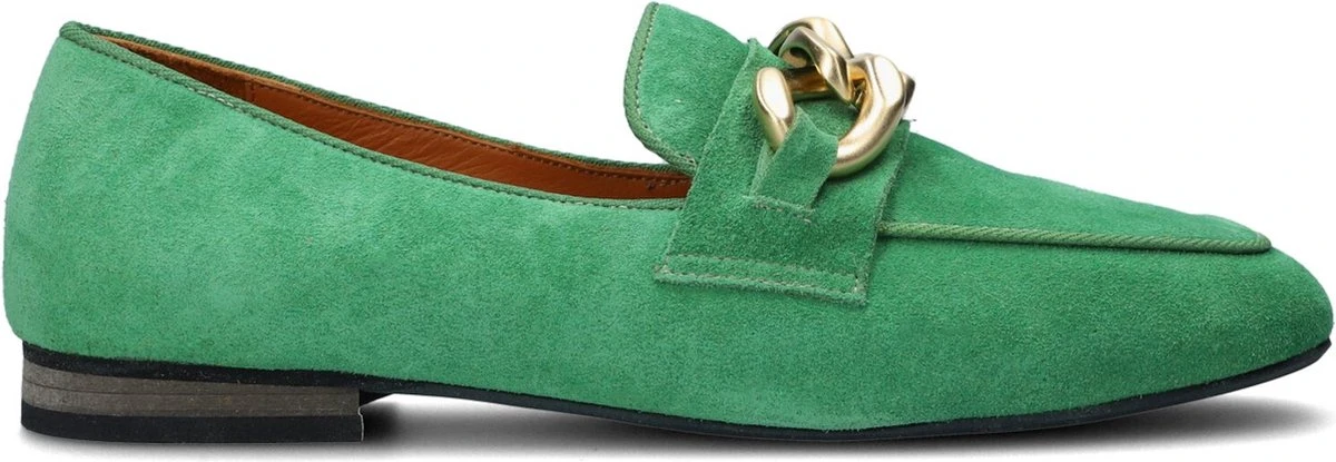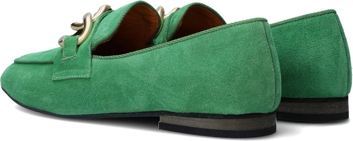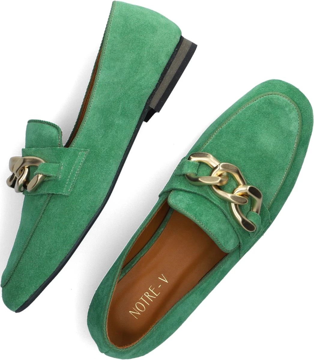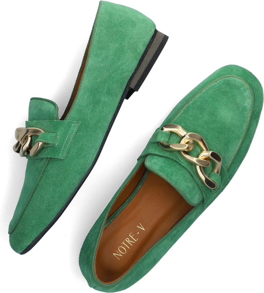 De elegante Italiaanse ontwerpen van het merk Notre-V zijn er voor de verfijnde vrouw die er graag effortless chic uit wil zien. Gemaakt van luxe materialen met subtiele accenten en een knipoog naar de laatste trends. Deze groene loafers 30056-06 zijn gemaakt van soepel en zacht suède en hebben een goudkleurige schakelketting op de wReef. Dit model is leer gevoerd met een vast voetbed en een suède hielstuk voor extra comfort. De zwarte, rubberen zool heeft een glad profiel met een gelaagd hakje van 1,5 centimeter hoog. Met deze mooie loafer geef je iedere outfit een chique uitstraling!