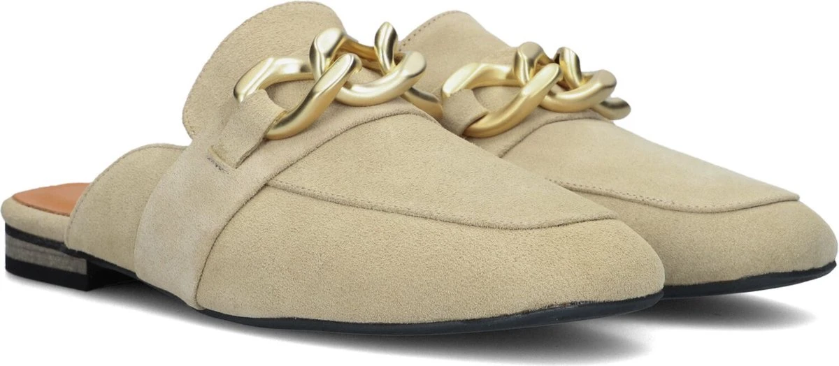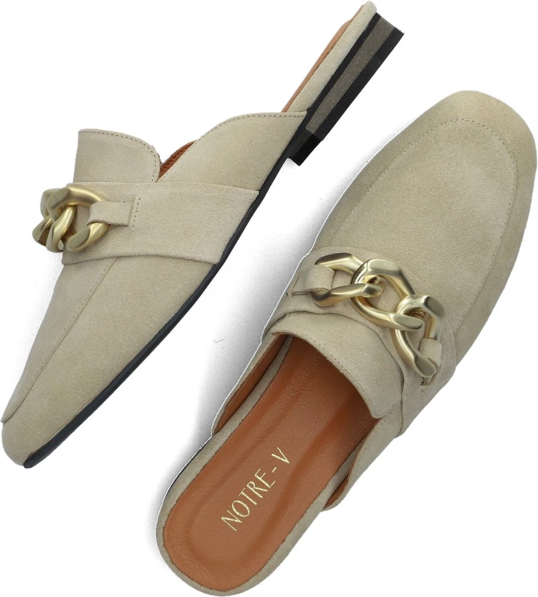 De elegante, Italiaanse ontwerpen van het merk Notre-V zijn er voor de verfijnde vrouw die er graag effortless chic uitziet. Gemaakt van luxe materialen met subtiele accenten en een knipoog naar de laatste trends. Deze opvallende loafer 5602-01 met open hiel is uitgevoerd in beige suède met een goudkleurig kettingdetail op de wReef. De voering is van leer en de schoen heeft een vast, leren voetbed met demping voor extra comfort. Verder heeft dit model een afgeronde carréneus en een laag hakje van 2,5 centimeter. Draag dit item onder een jeans, jurk of rok. Waar ga jij voor?