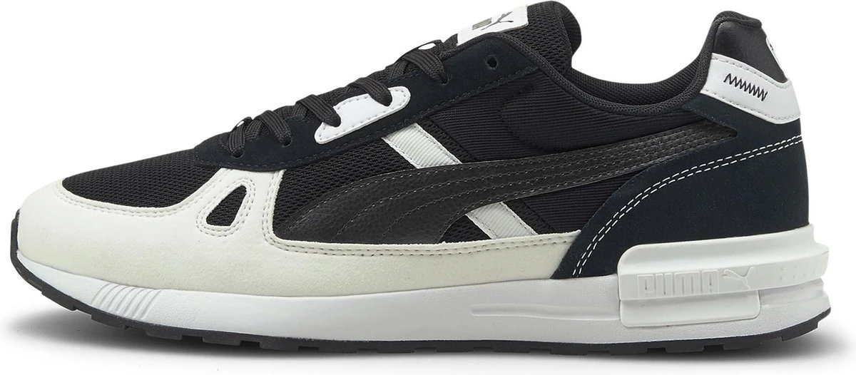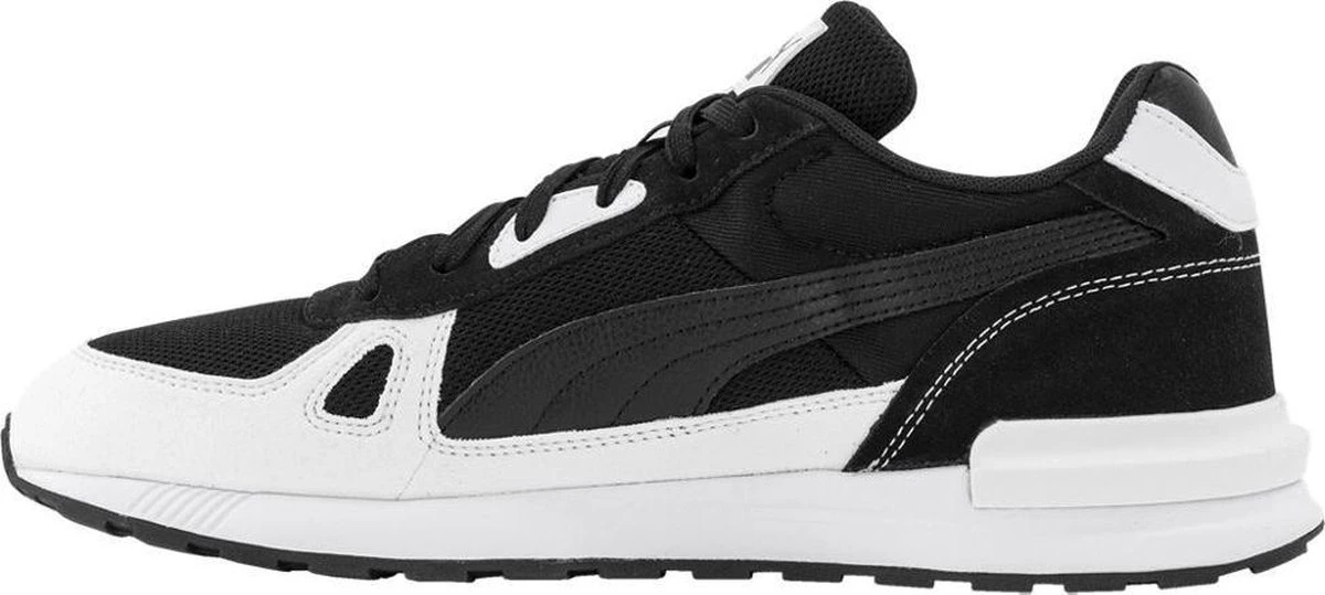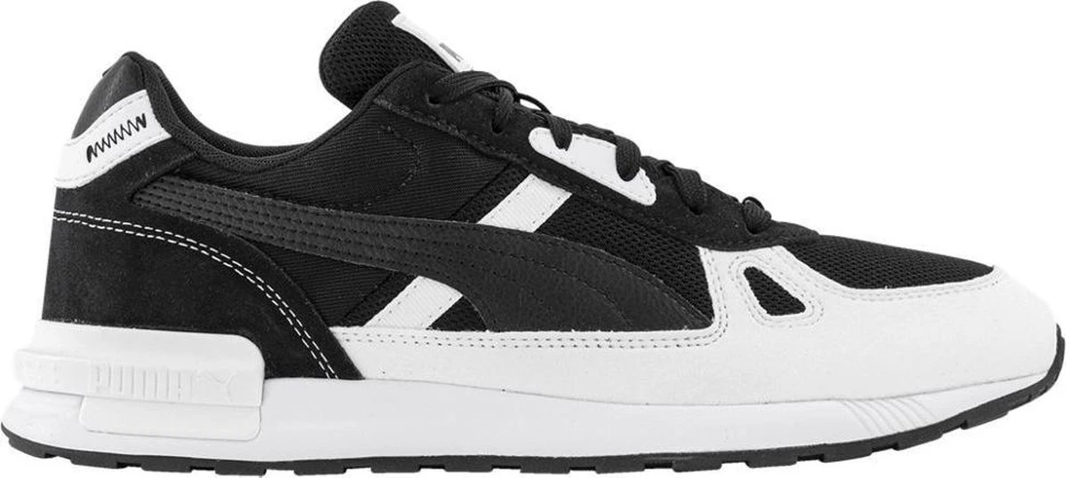 Met de Puma Graviton Pro kom je altijd hip en gekleed voor de dag. Deze zwarte Puma sneaker heeft witte details en een comfortabele rubberen loopzool. Combineer de sneakers onder je favoriete outfit en kom de dag comfy en trendy-sportief door.