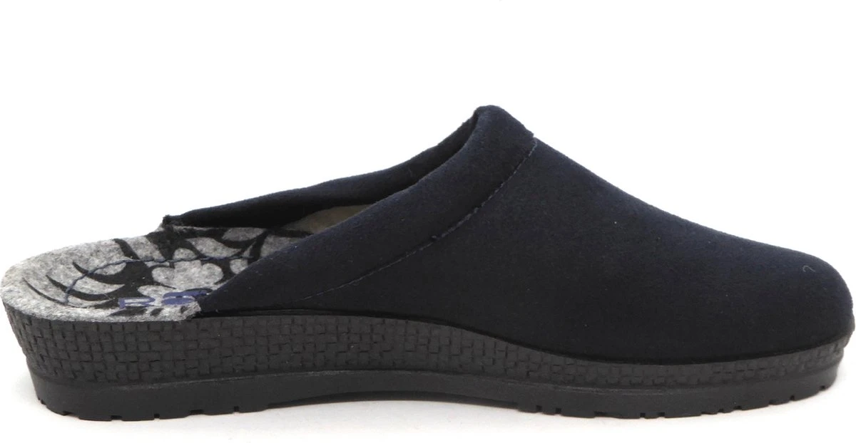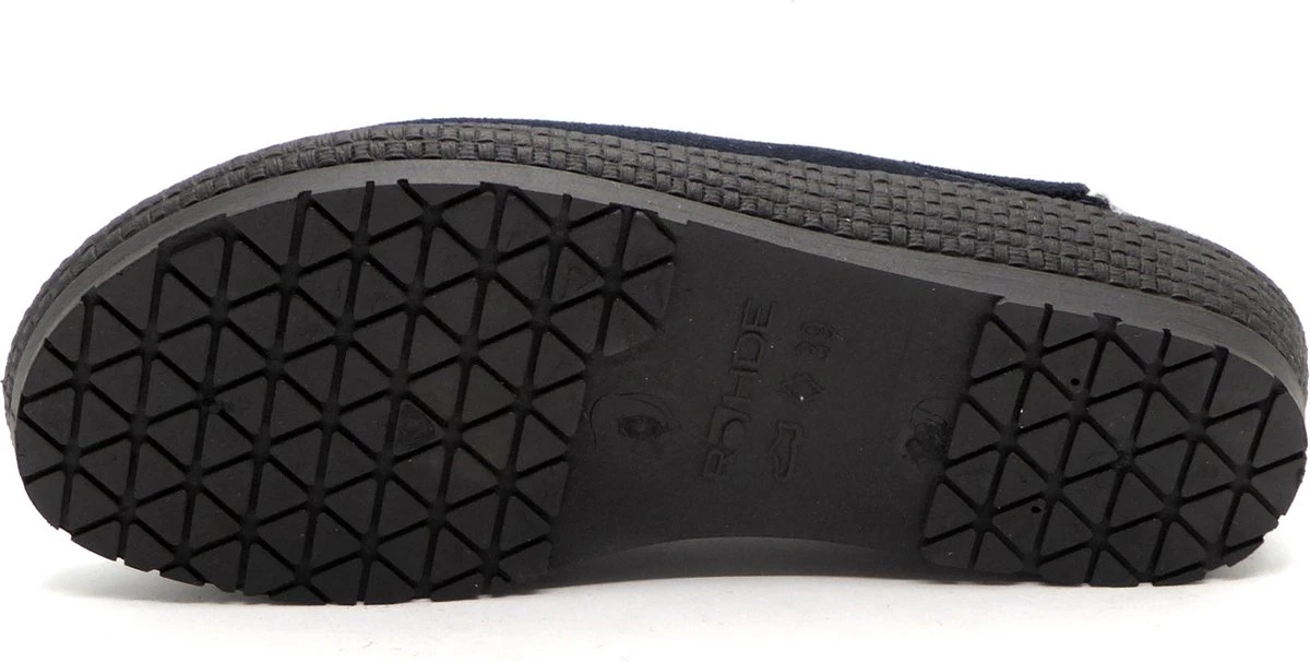 Blauwe Rohde pantoffels gemaakt van textiel, net zoals de comfortabele binnenzool. Ter decoratie zijn er stiksels en een printje en een merkopdruk op de binnenzool aangebracht. De rubberen zool van de Rohde pantoffels loopt bij de hak iets omhoog en heeft daar een dikte van 2 centimeter. Het voetbed van de blauwe Rohde pantoffels is niet uitneembaar.