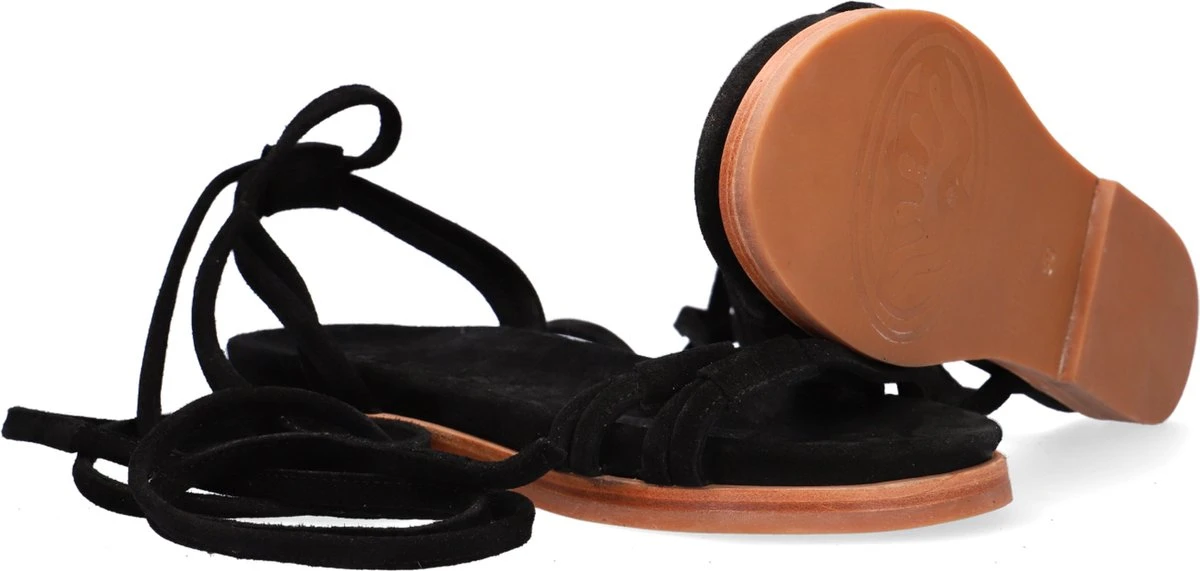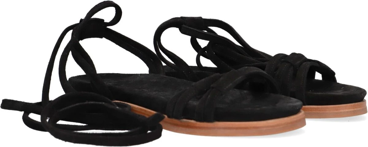 Het streven van het Amsterdamse merk Shabbies is dat jij je zelfverzekerd en goed voelt met iedere stap die je zet. Dat doen ze door toffe schoenen te maken van mooie materialen met een hoge kwaliteit, een uniek design en een vrouwelijke touch. Deze zwarte sandaal 170020161 is gemaakt van zacht soepel suède en heeft dunne bandjes over de voorvoet en een fijne lange veters rondom de enkel die je zelf op maat kunt maken door er een knoop in te maken. Het binnenwerk is van suède en het licht opgevulde voetbed is voorzien van merkopdrukken. De zool heeft een houtlook afwerking aan de zoolrand en een rubberen loopzool.
