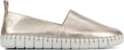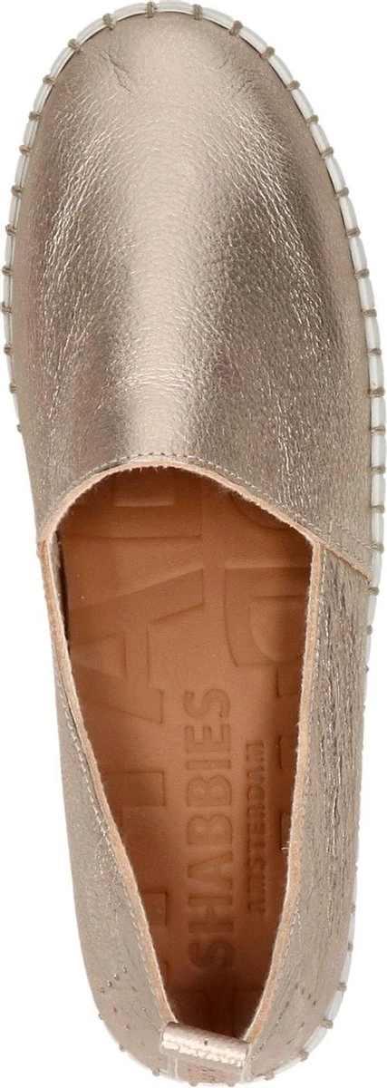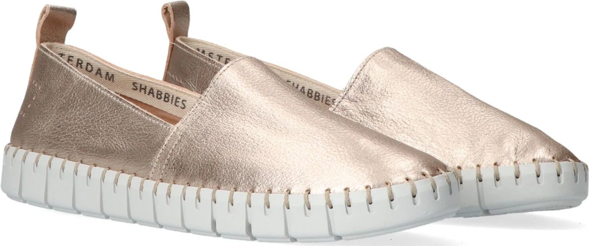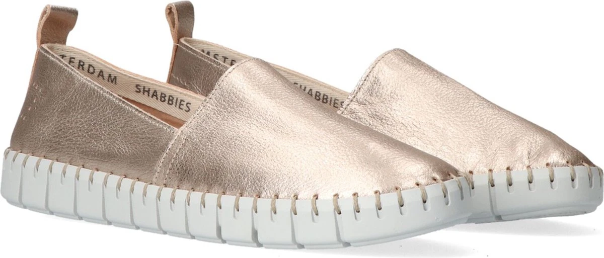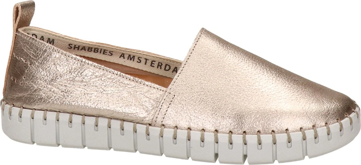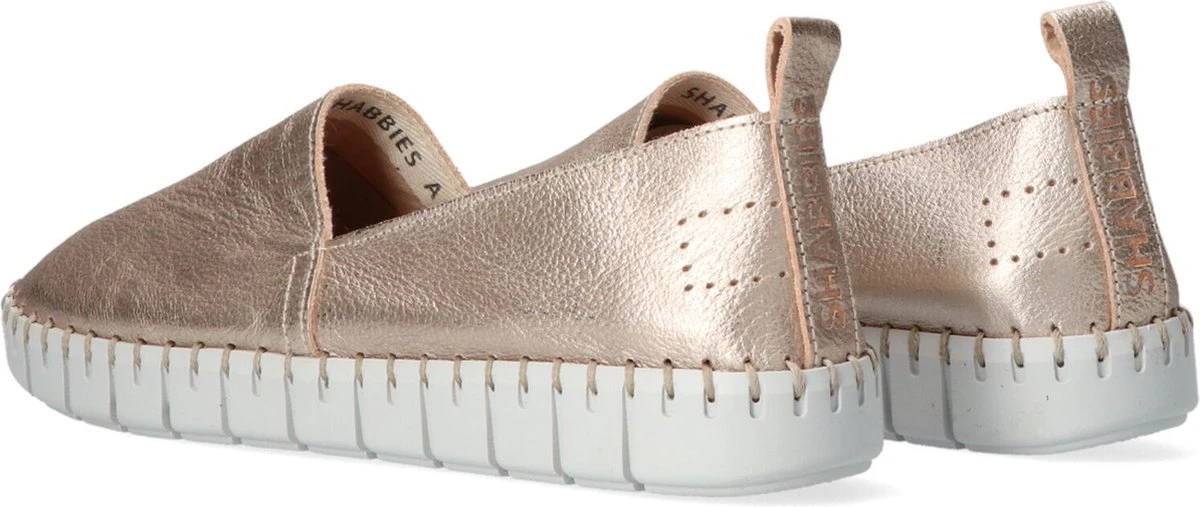 Goudkleurige instapper voor dames van het merk Shabbies. Dit instapmodel met ronde neus is uitgevoerd in goudkleurig leer. De schoen loopt over in de loopzool door middel van stiksels. De binnenkant is uitgevoerd in leer en het uitneembare voetbed is te vervangen door een persoonlijke inlegzool. De rubberen loopzool heeft een grof profiel voor stevige grip.
