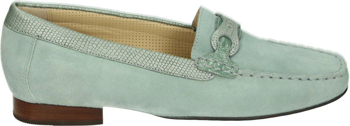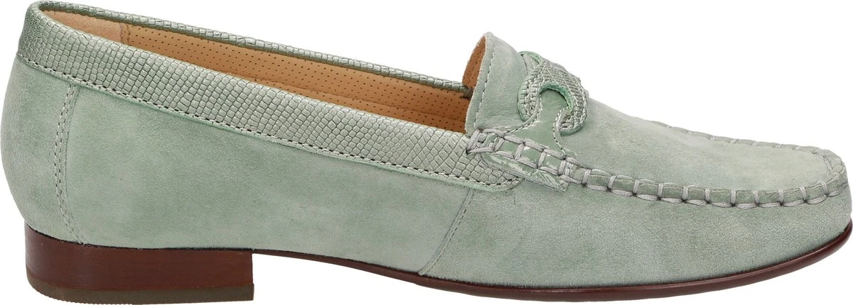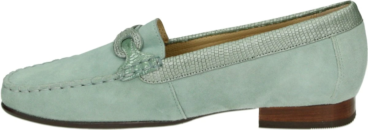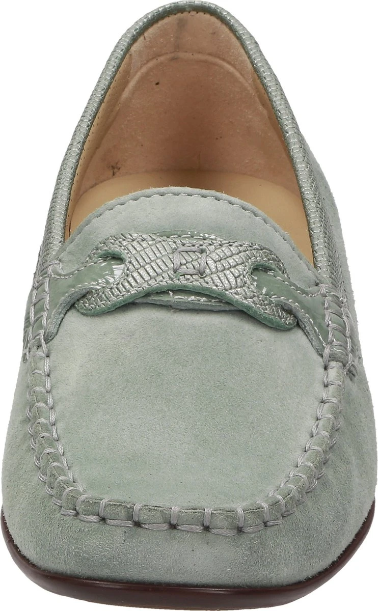 Modische dames-instapper van geitensuède, lakleer en geitenleer met krokoprint, in de schoenwijdte F voor normale voeten. Met de hand vervaardigde damesschoen voor maximaal comfort. Leren voering en uitneembaar, zacht en doorlopend wisselvoetbed van leer. Zachte en fijne rubberzool met platte hak. Een typische dames-mocassin van Sioux.
