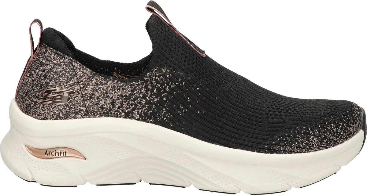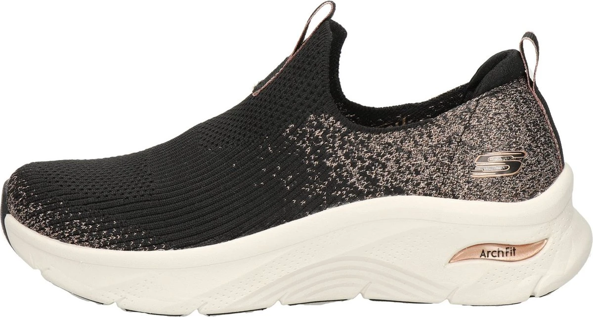 Skechers Arch Fit D`Lux dames instapschoen. Glitter maakt alles beter! Zo ook deze instappers van Skechers. Uitgevoerd in fijn Stretch-textiel voor een perfecte pasvorm en zacht draagcomfort. Voorzien van een gewatteerde hiel voor een zachter draaggevoel. De zool is ontwikkeld in samenwerking met podologen en biedt de perfecte steun en demping die de voeten nodig hebben. Afgewerkt met een zachte rubberen zool die bijdraagt aan de demping en steun die de schoen biedt.