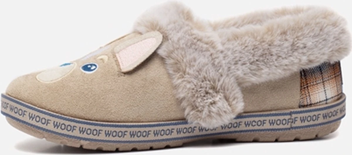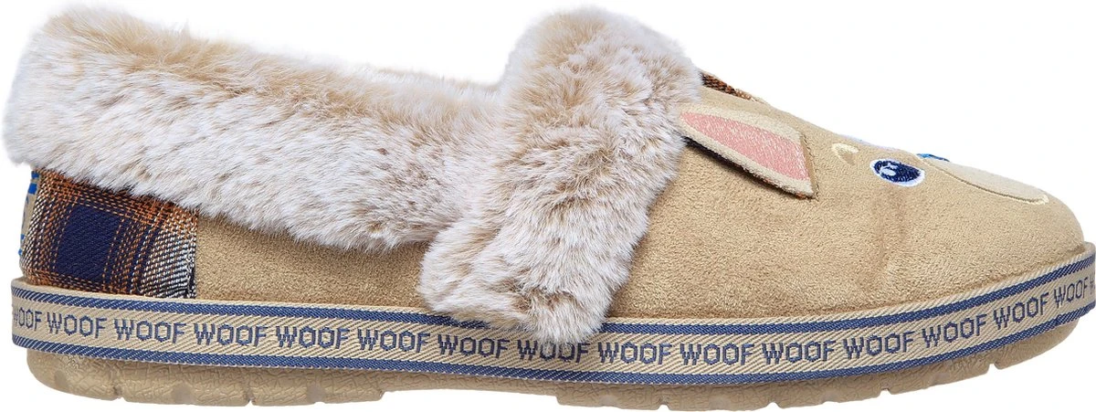 Ben jij een echte hondenliefhebber? Dan zijn deze Skechers Too Cozy Dog-Attitude pantoffels in de kleur taupe perfect voor jou! Het bovenwerk is gemaakt van imitatiesuède. Dankzij de heerlijke voering en comfortabele binnenzool van imitatiebont blijven jouw voeten lekker warm. Het bovenwerk is voorzien van oren, ogen en een neus van een lief hondje. Aan de achterkant is een geruite inzet aangebracht. Langs de rand van de zool is ‘woof’ geschreven. Het Memory Foam voetbed zorgt voor demping tijdens het lopen. Deze pantoffels kan je zowel binnenshuis als buitenshuis dragen door de rubberen loopzool. Deze zool heeft een dikte van 1 centimeter. Goed om te weten: het voetbed van deze Skechers Too Cozy Dog-Attitude pantoffels is niet uitneembaar.