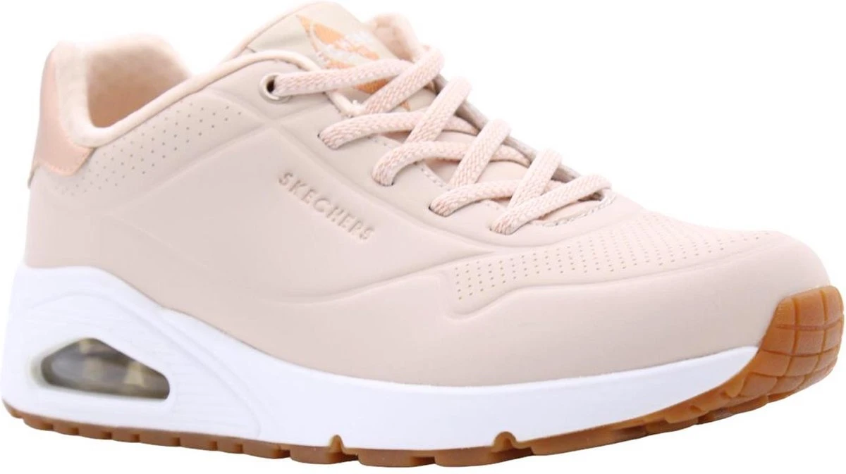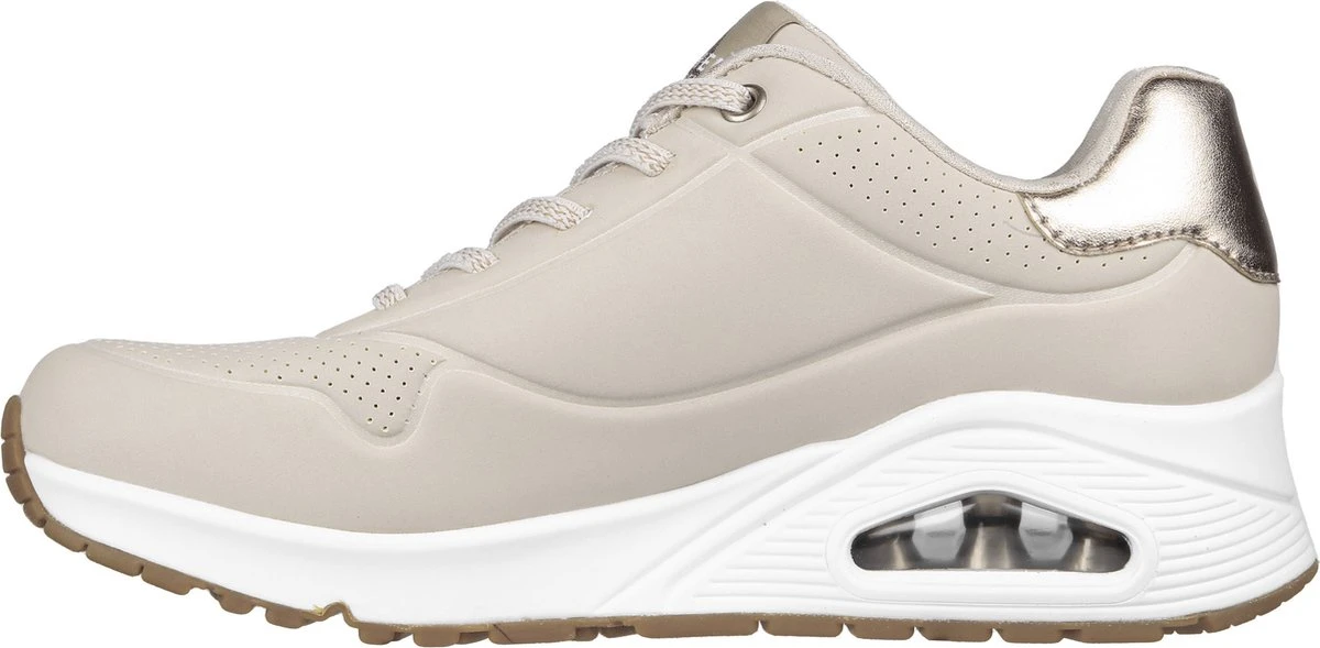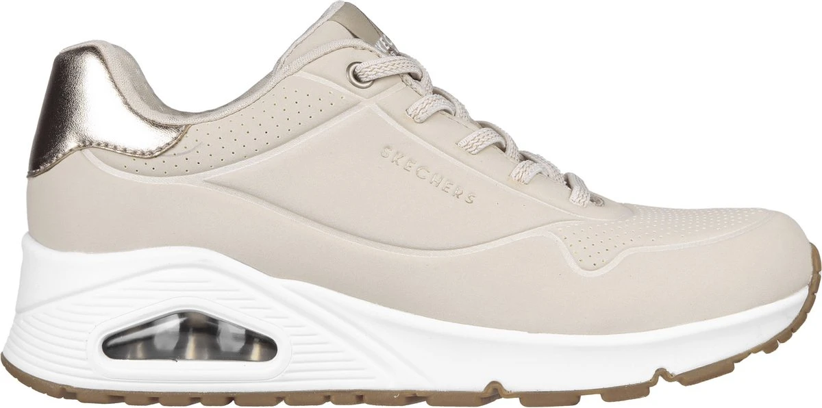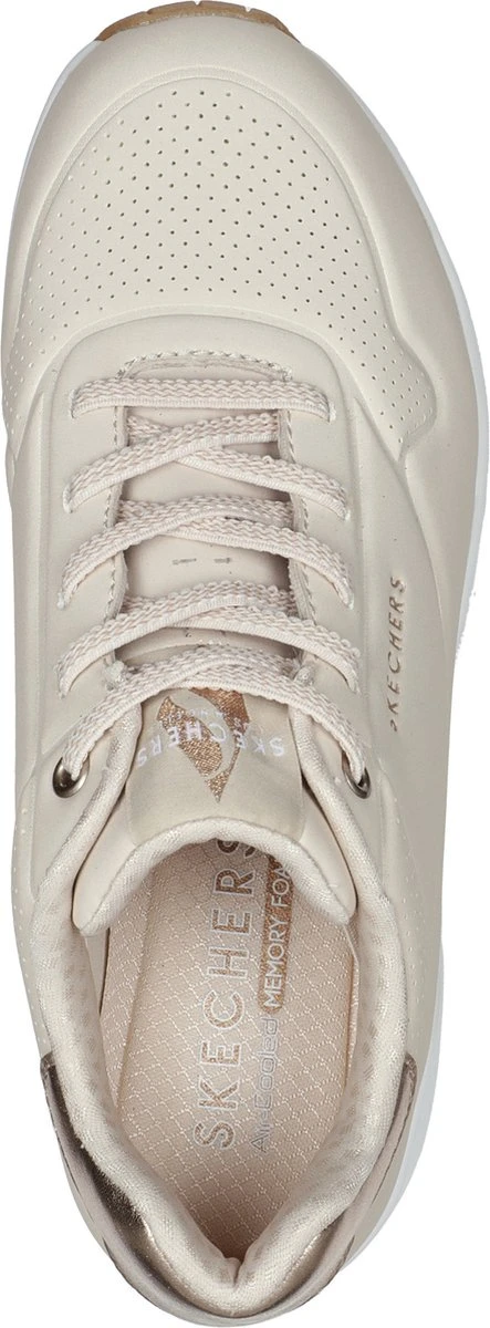 Skechers Uno Shimmer Away beige sneakers dames Een heerlijk en zeer comfortabele sneaker dankzij de Air-Cooled Memory Foam binnenzool. Dit model is uitgevoerd in imitatieleer en voorzien van perforatie accenten en gouden accenten. De binnen voering is van textiel. Het Air-Cooled Memory Foam voetbed zorgt ervoor dat de schoen ademend is en hoog comfort biedt. Voorzien van een rubberen profielzool met luchtkussens in de tussenzool die de schokken absorberen. Elastische veter voor een gemakkelijke instap. Kleur: beigeMateriaal bovenwerk: synthetisch