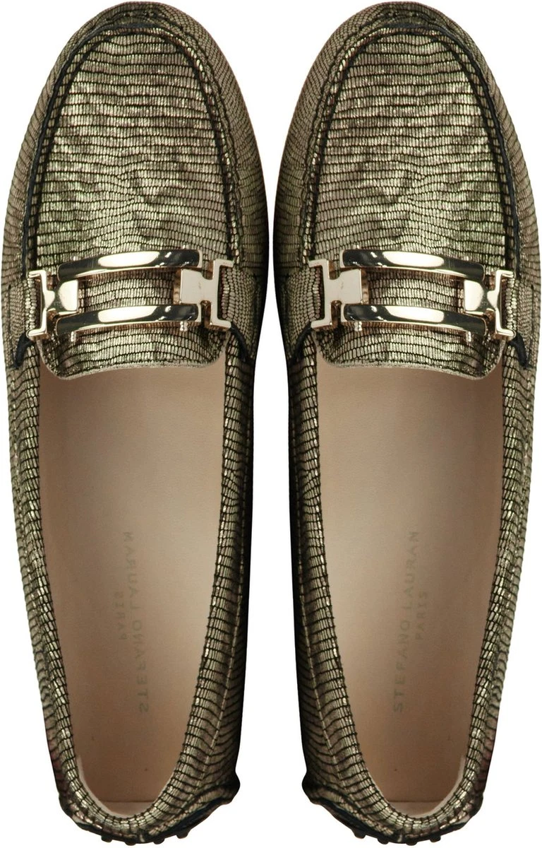 Damesschoen model S3038 in de kleur goud van Stefano Lauran Pasvorm Dit model van Stefano Lauran valt normaal op maat Beschrijving Instapper met gesp voor dames van het merk Stefano Lauran. Deze blauwe instapper met halfronde neus is uitgevoerd in goudkleurig suède met print. Op de neus is een goudkleurige gesp terug te vinden als decoratie. De binnenkant is uitgevoerd in leer en een stevig contrefort draagt bij aan het loopgemak. De rubberen zool heeft een noppenprofiel welke doorloopt op de achterbies.