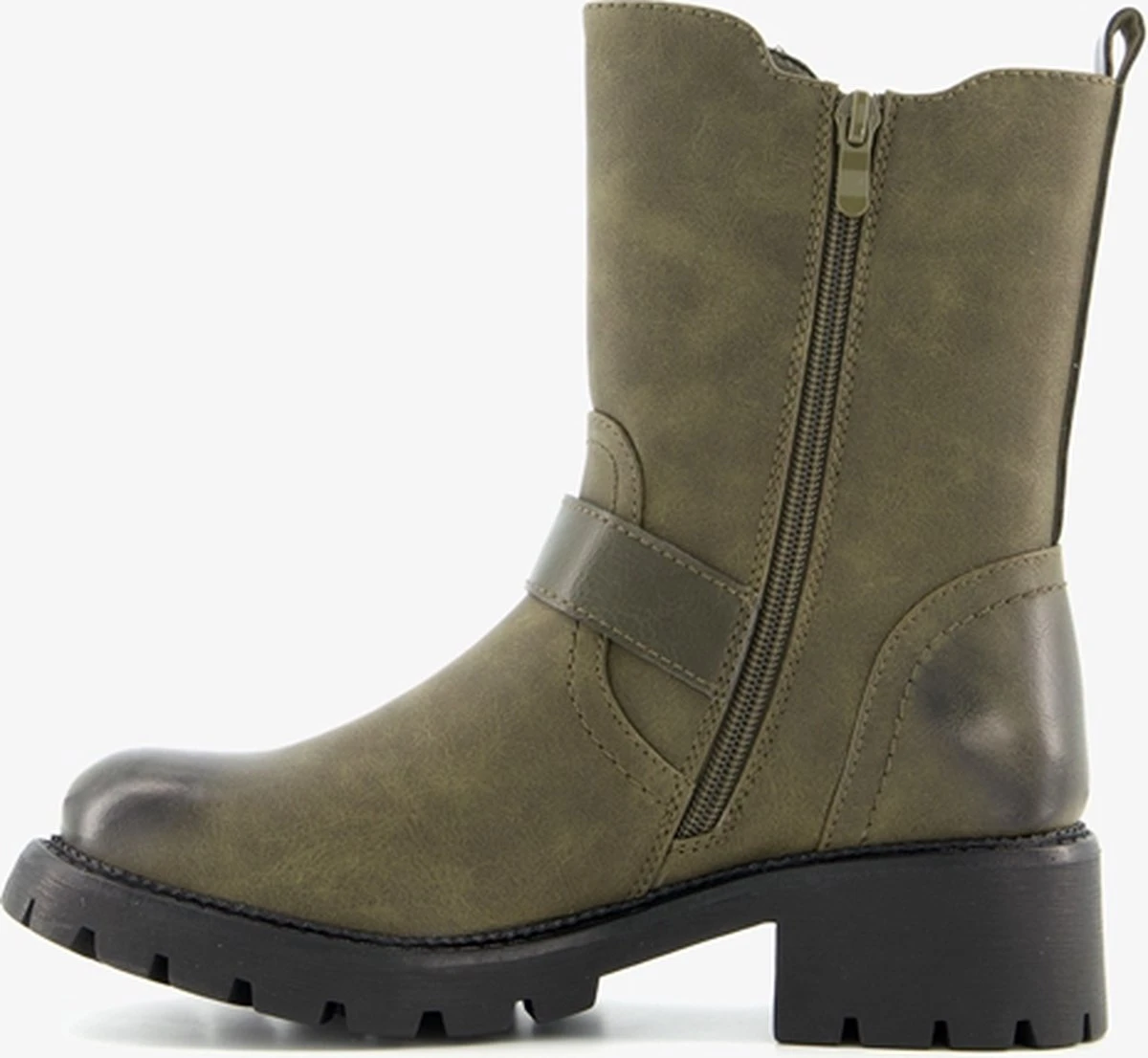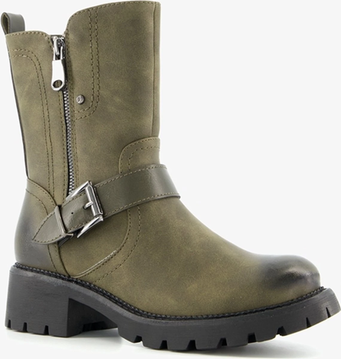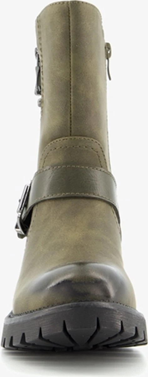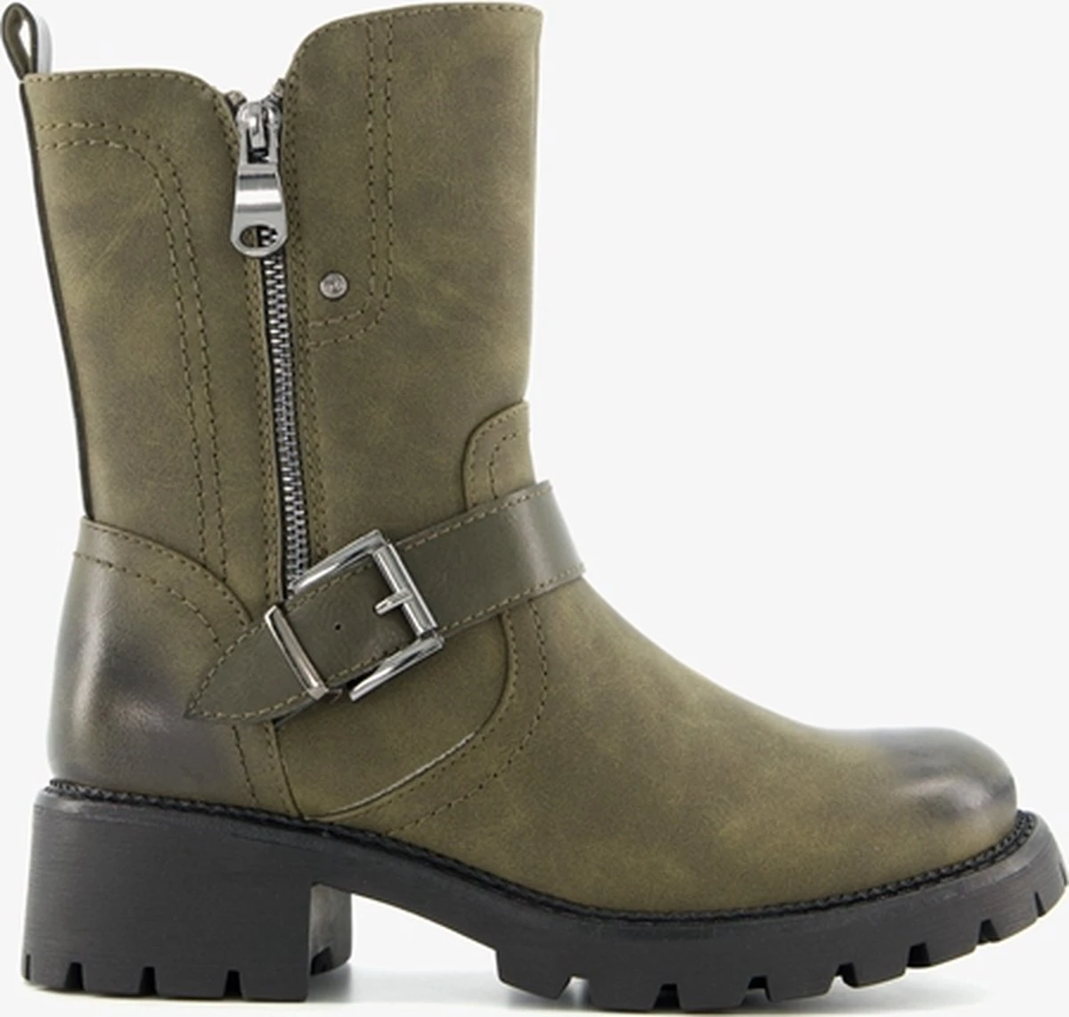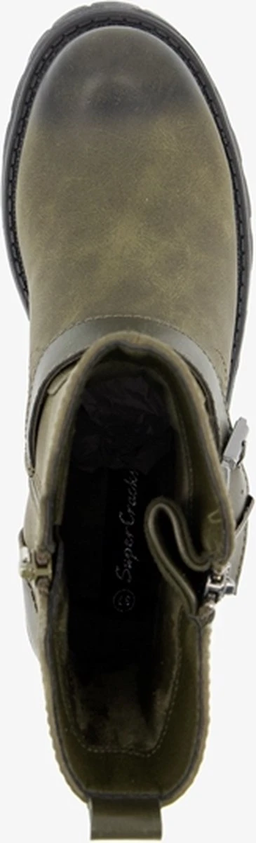Donkergroene bikerboots van Supercracks. Gemaakt van imitatieleer, een binnenwerk van textiel en een stevige profielzool. De boots hebben een binnenzool van textiel, deze is niet uitneembaar. Voorzien van een decoratieve gesp rondom de enkel en een decoratieve rits aan de buitenzijde. Voorzien van ritssluiting aan de binnenzijde en een aantreklusje. De schachthoogte is 18 cm. De hakhoogte is circa 3 cm.