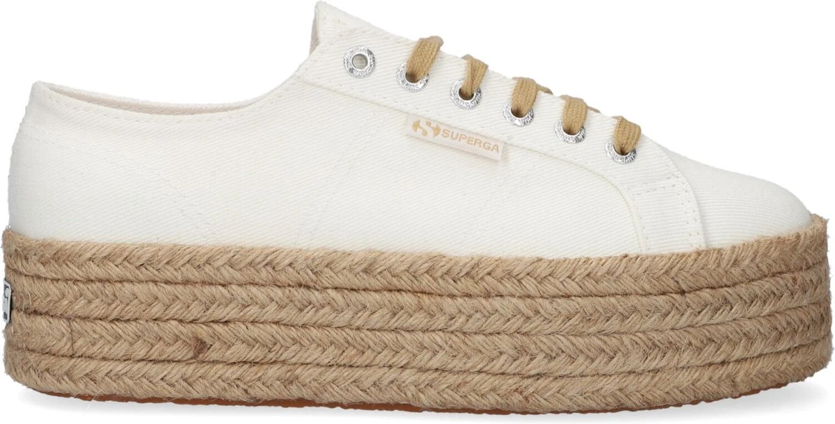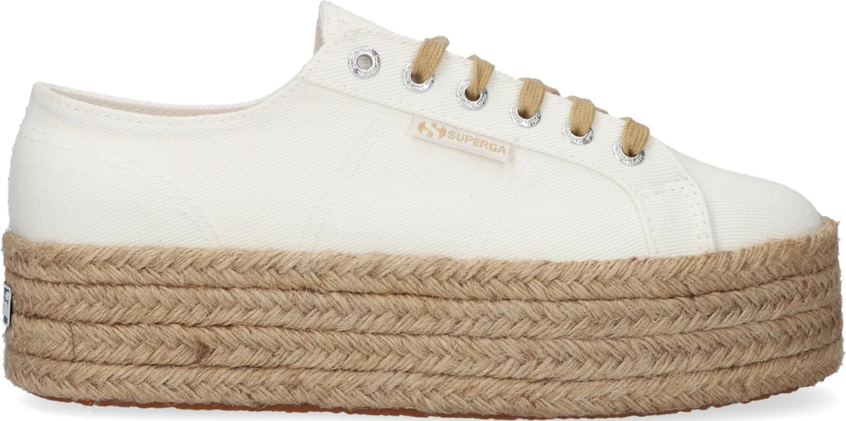 Uit de collectie van het Italiaanse merk Superga is deze trendy lage platformsneaker 2790 Drill Denim Rope met vetersluiting. Dit model is geheel uitgevoerd in off-white canvas en heeft een vaste binnenzool. Dit casual exemplaar is afgewerkt met biezen en zilverkleurige veterringetjes. Leuk detail zijn de bruine veters De sneaker heeft een opvallende platformzool van 4,5 centimeter dik en is afgewerkt met gevlochten jute. De stevige schoenzool is uitgevoerd in rubber en heeft een fijn profiel.