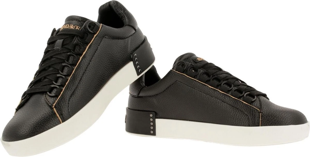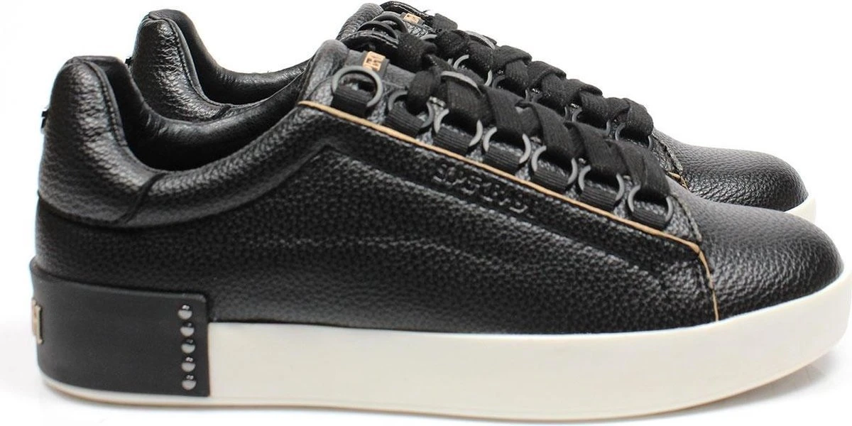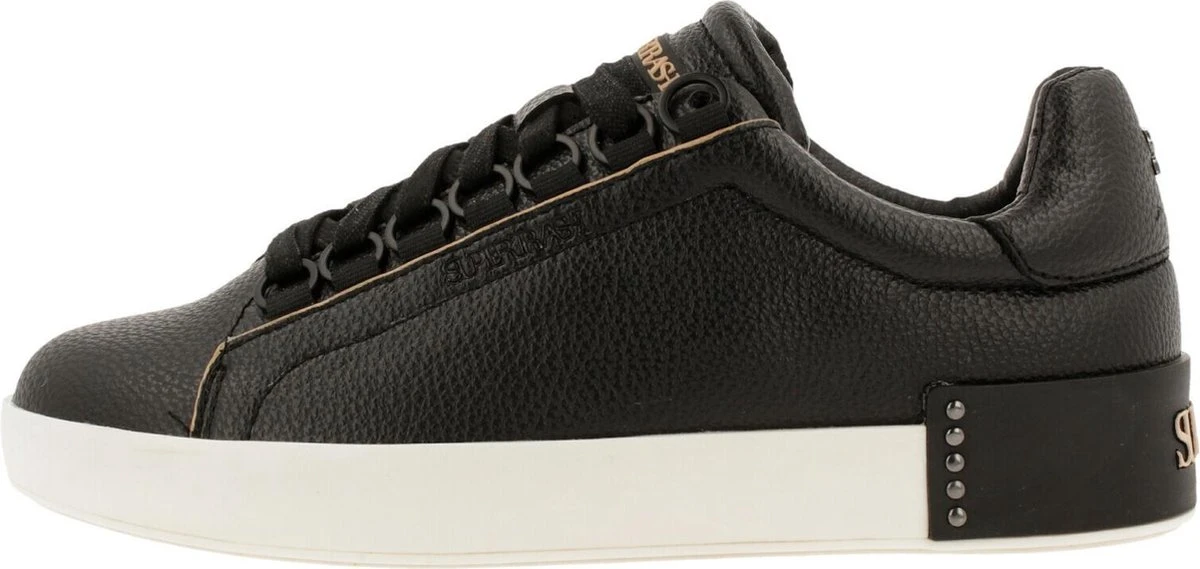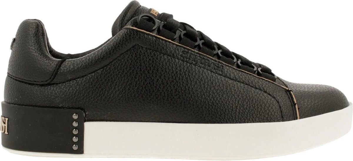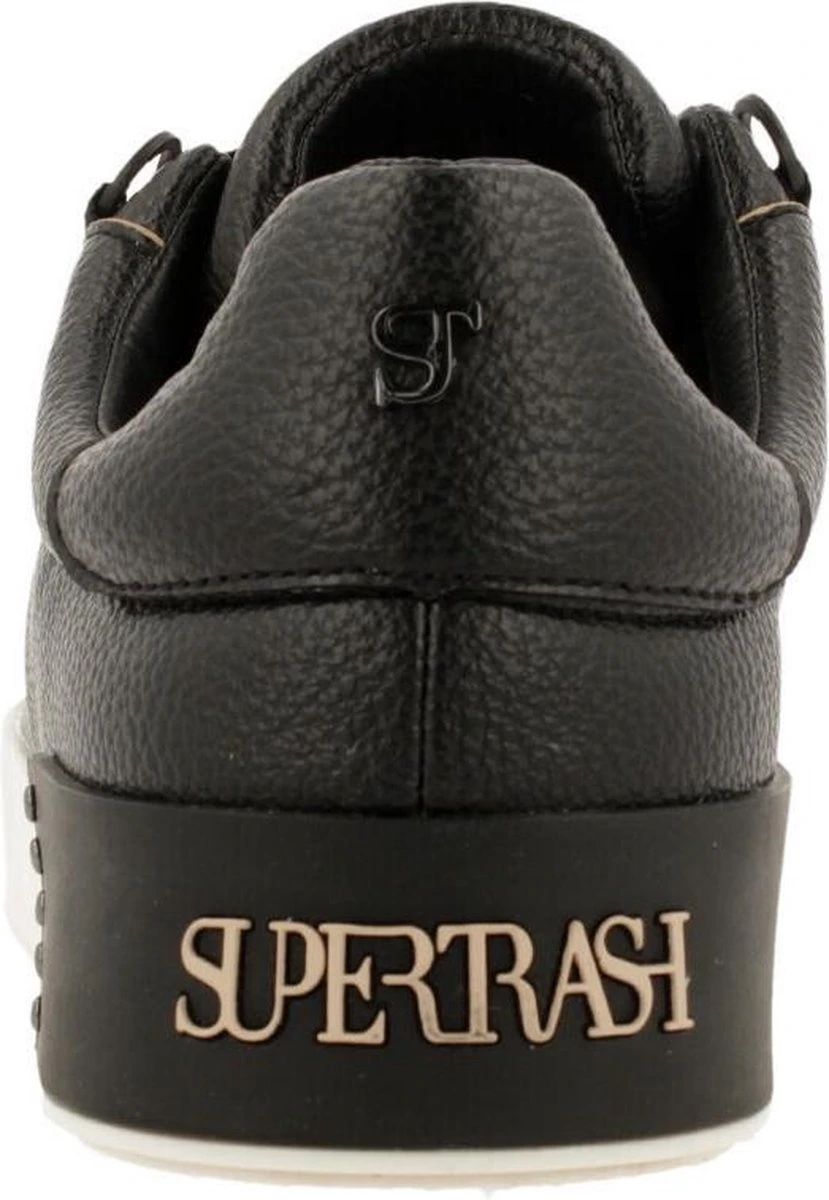 Sportieve damessneaker van SuperTrash in tumbled leather look uitvoering. De schoen is heeft een brede witte zool, uitneembaar voetbed en studded details.