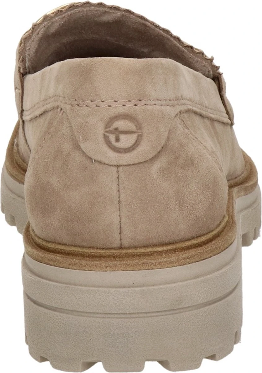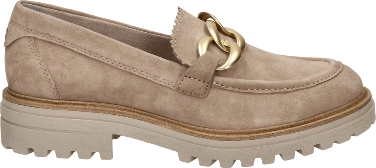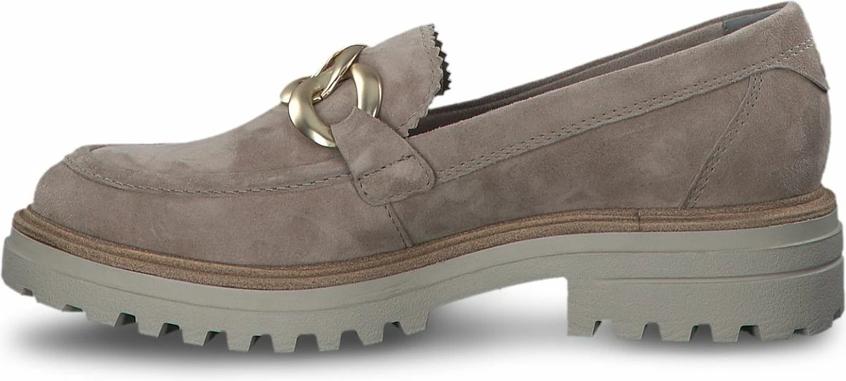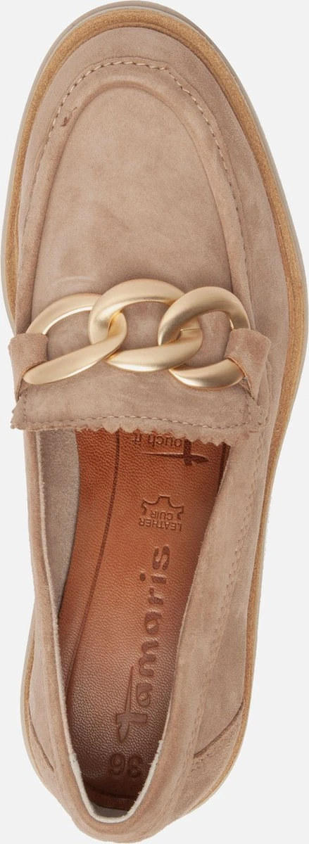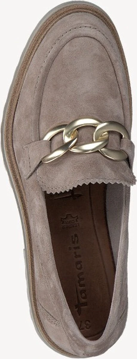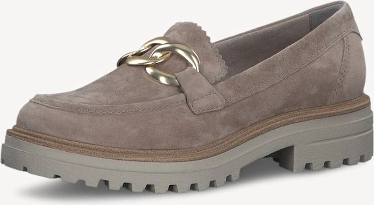 Met deze taupe Tamaris instappers zit je altijd goed. Dit model heeft een stoere profielzool en is voorzien van een goudkleurige ketting die over de wreef heenloopt. De schoenen zijn volledig gemaakt van leer. Dat houdt in dat naast het bovenwerk ook de voering en de comfortabele binnenzool van dit materiaal gemaakt zijn. Door het instapmodel trek je deze schoenen in een mum van tijd aan en uit. Het voetbed is voorzien van de Touch It technologie, waardoor het voetbed zicht aanpast aan jouw voeten. Dit zorgt voor optimaal draagcomfort. De rubberen zool heeft een hoogte van 4 centimeter.