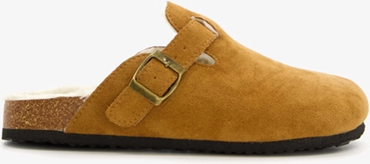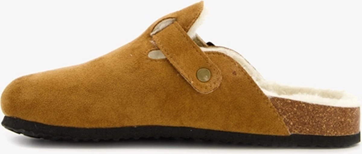 Cognac bruine instappers voor dames uit de Thu!s collectie. Gemaakt van imitatie suede, een binnenwerk van textiel en een stevige zool. De pantoffels hebben wreefbandje met gespsluiting, een warme voering en een comfortabel voetbed.