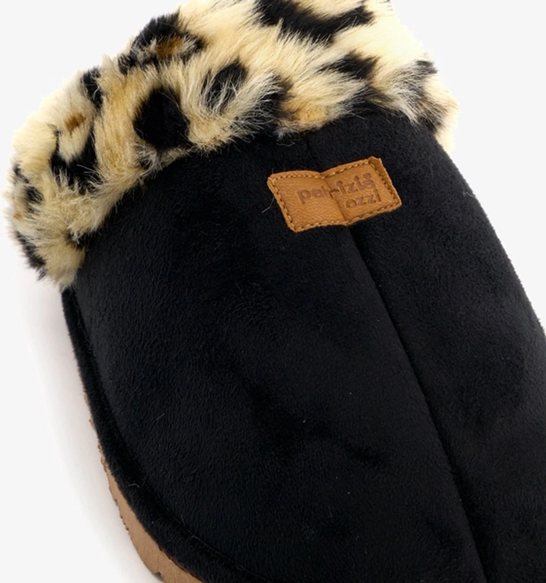 Zwarte pantoffels voor dames. Gemaakt van textiel, een binnenwerk van textiel en een stevige zool. De pantoffels hebben een warme en zachte voering, comfortabel voetbed en luipaardprint.