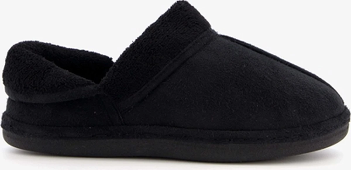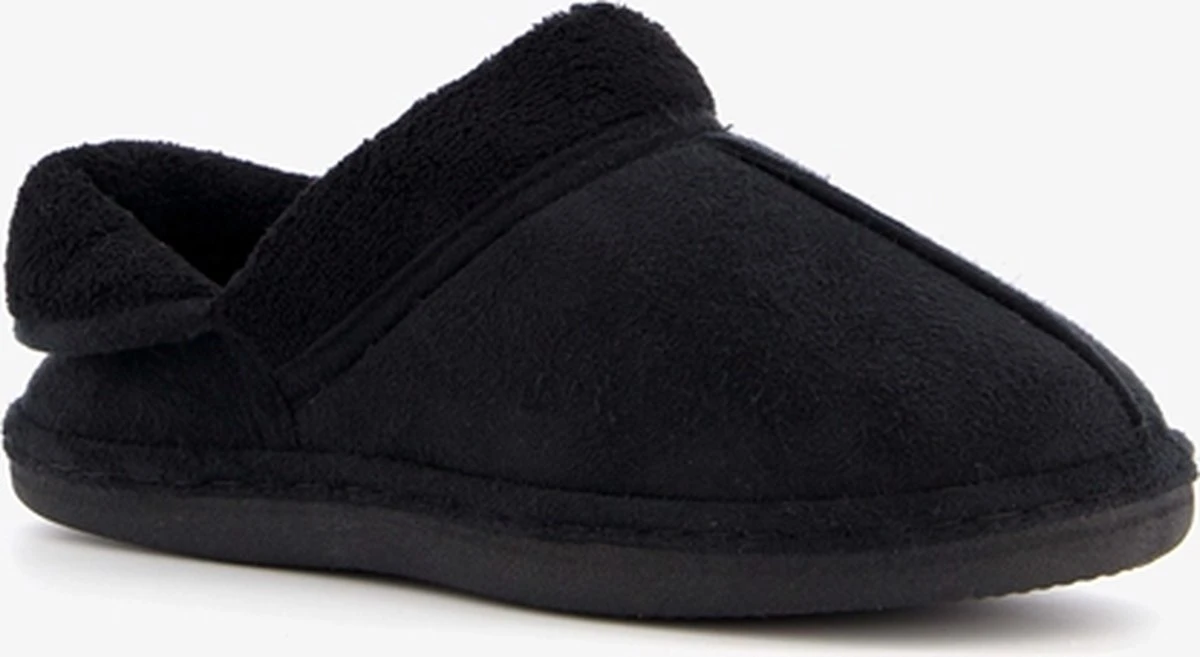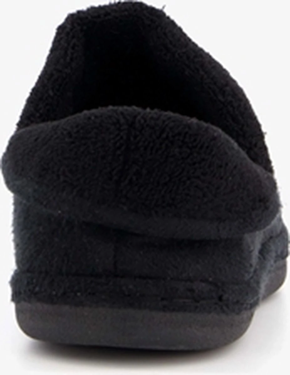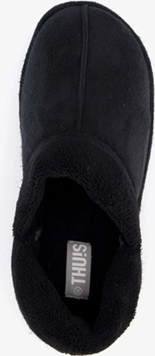 Zwarte, gevoerde pantoffels voor dames van Thu!s. Gemaakt van textiel, een binnenwerk van textiel en een stevige profielzool. De pantoffels hebben een zachte, warme voering en een comfortabel voetbed.