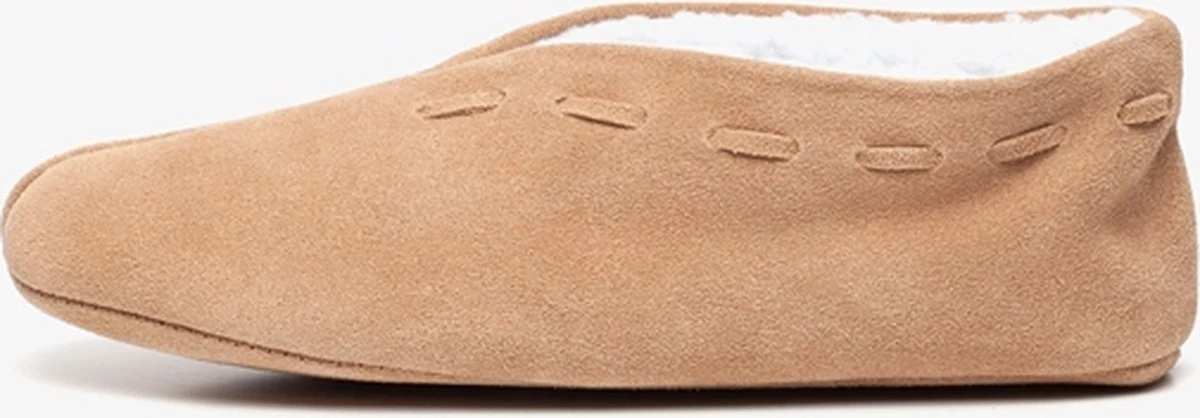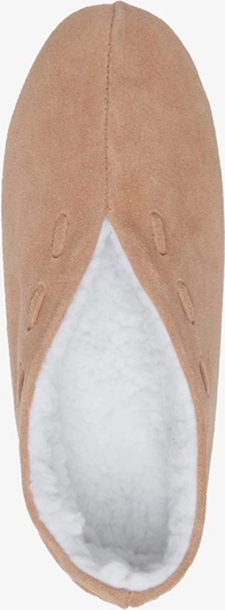 Beige spaanse sloffen voor dames. Gemaakt van suedeleer, een binnenwerk van textiel en een gladde zool van leer. De sloffen hebben een zachte teddyvoering zodat je voeten lekker warm blijven.