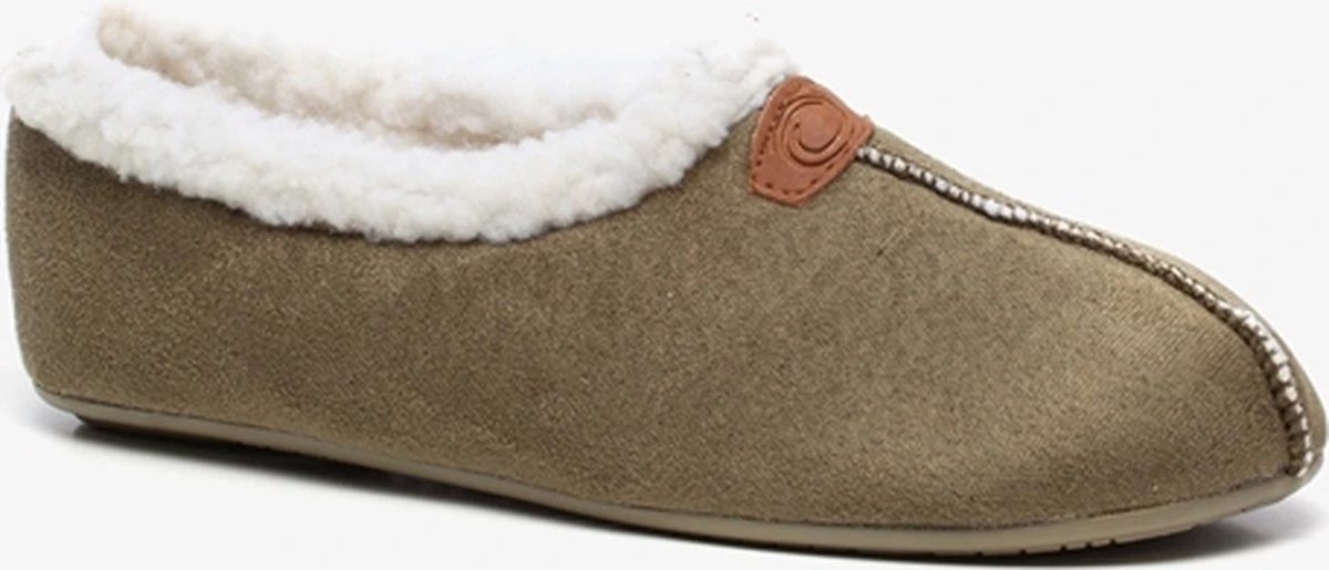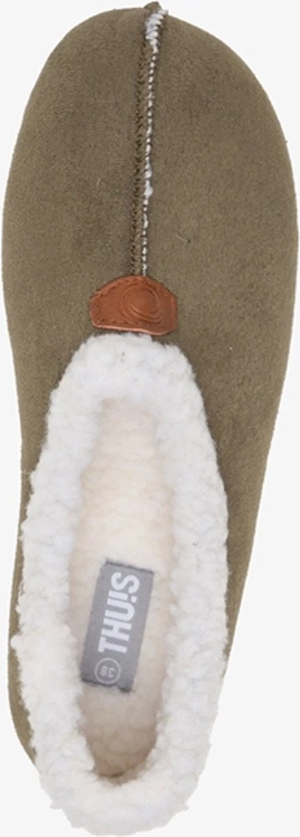 Groene pantoffels voor dames van Thu!s. Gemaakt van textiel, een zachte teddyvoering van textiel en een stevige zool. De pantoffels hebben een comfortabel voetbed.
