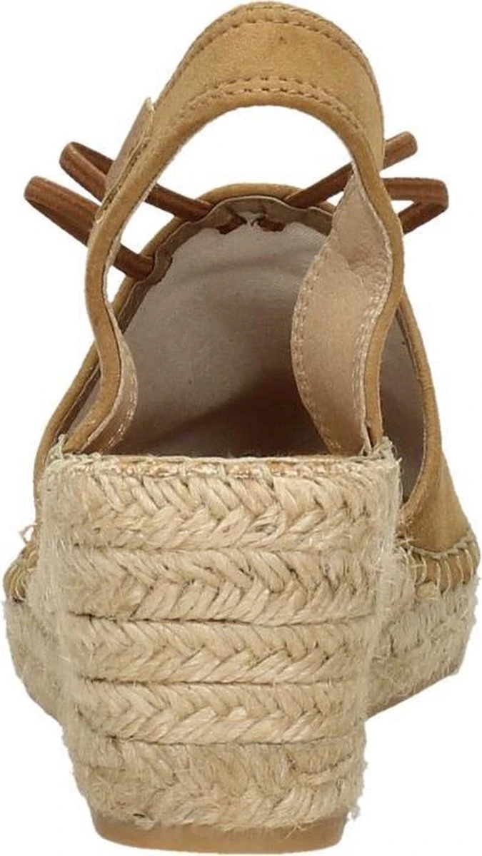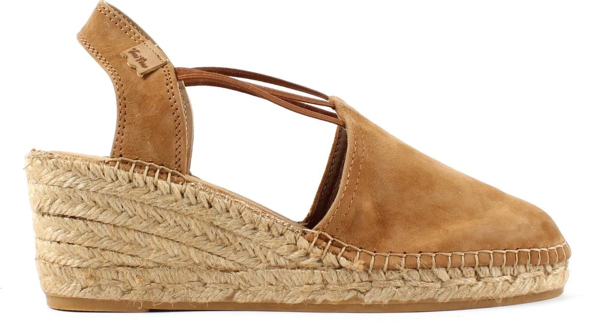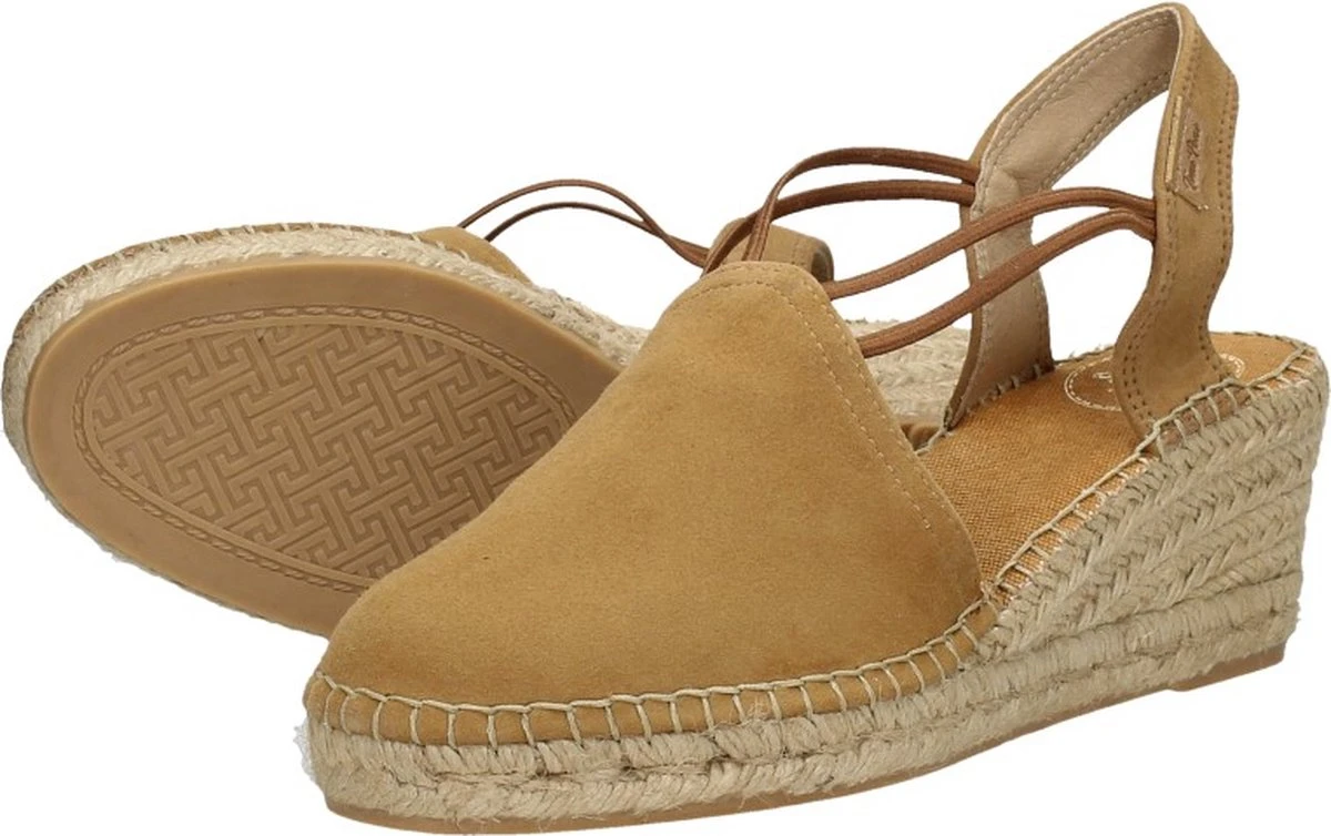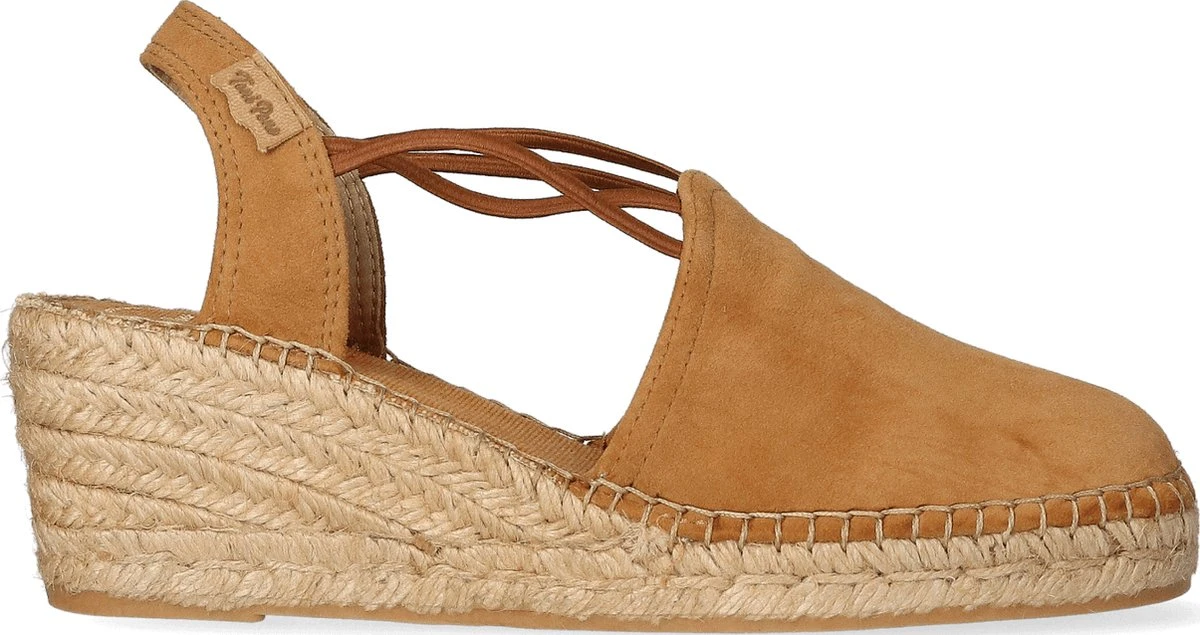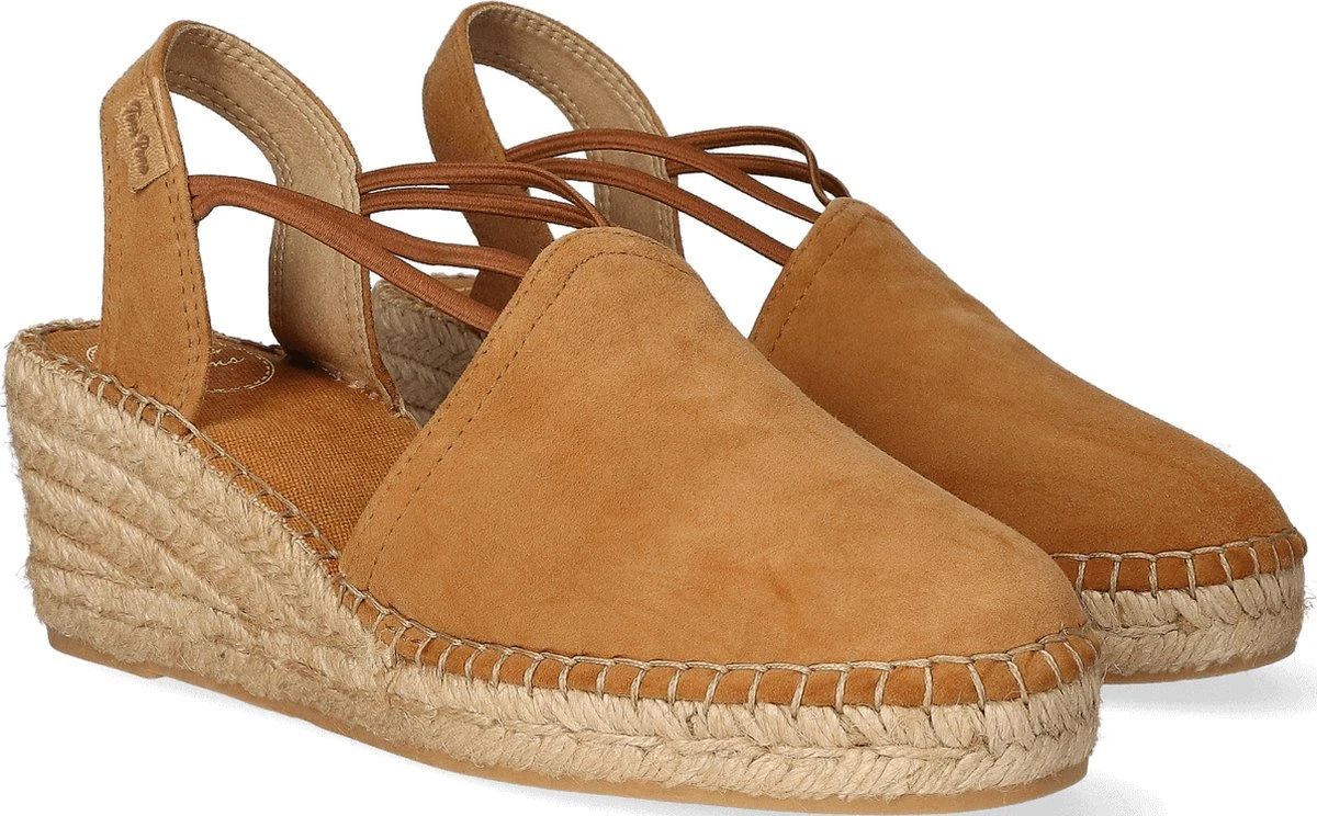 Cognackleurige Toni Pons Tremp espadrilles gemaakt van suede, met een binnenzool van leer en een voering van textiel. Naast dat de sandalen van Toni Pons zijn gemaakt van natuurlijke materialen zijn ze ook altijd handgemaakt in Spanje! Voor een goede pasvorm en draaggemak zijn deze damesschoen voorzien van elastieken bandjes. De schoenen hebben een sleehak met gevlochten touw die een hoogte heeft van 5 centimeter. De loopzool van rubber voorkomt slijtage zodat je lang van de Toni Pons Tremp espadrilles kan genieten.