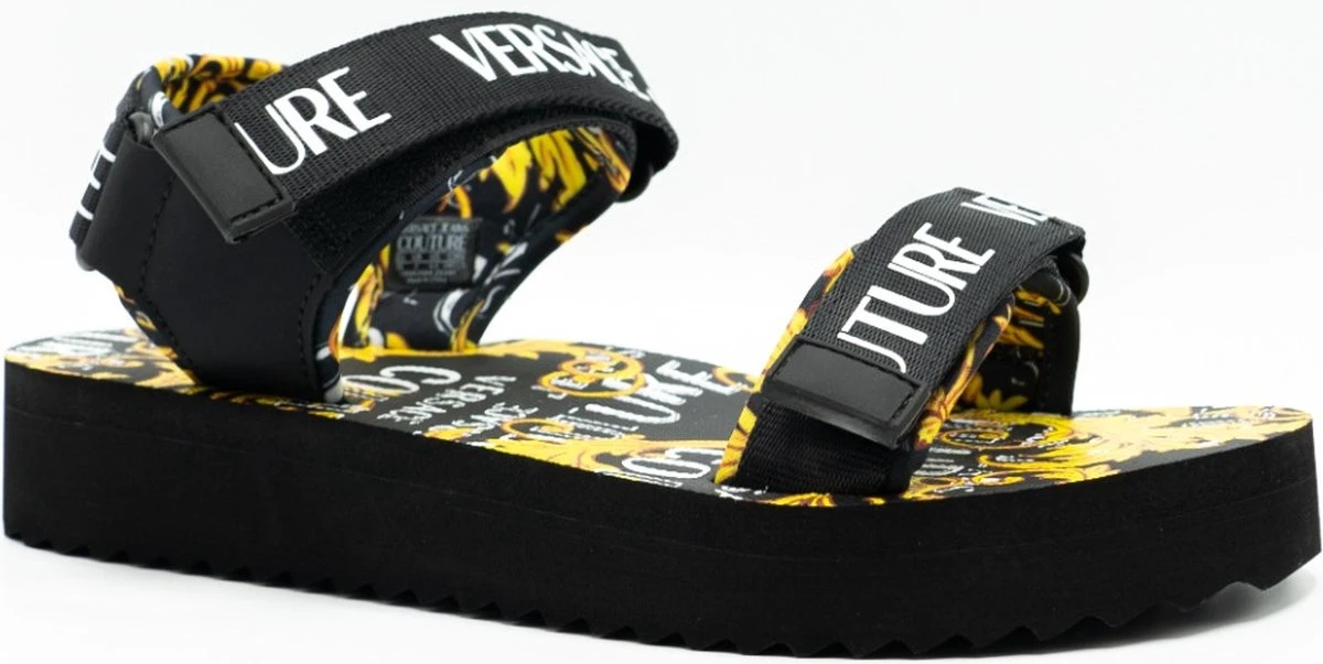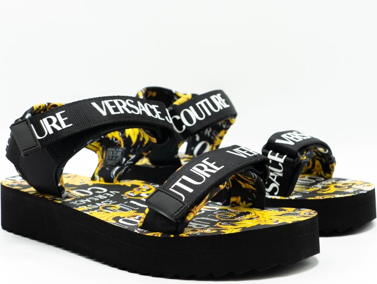 Miami Beach Dames Sandalen Dis. SX4 De dames sandalen uit de nieuwste collectie van Versace Jeans Couture. Deze dames sandalen zijn zwart van kleur met goudkleurige details. De sandalen zijn voorzien van een band bij de tenen en om de enkel met een wit merklogo erop en een chunky zool met baroqueprint. Draag deze slippers onder elke zomeroutfit!